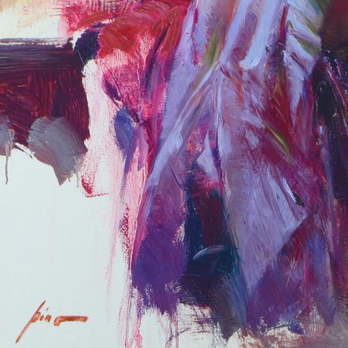Siesta by Pino (1939-2010). Pino's portraits allow glimpses into intensely personal, intimate spaces, conveying emotion through rich, warm color and sensual brushwork. "Siesta" is an artist-embellished limited edition giclee on canvas by Pino (1939-2010). The piece is numbered, hand signed, and includes certificate of authenticity. Measures approximately 34" x 34" (image).