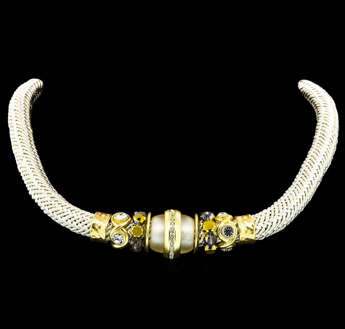 High end designer jewelry. Silk Crystal Necklace - Gold Plated. Gold Plated Clasp. Nude/ Gold. Short. Total Weight: 50 grams.
