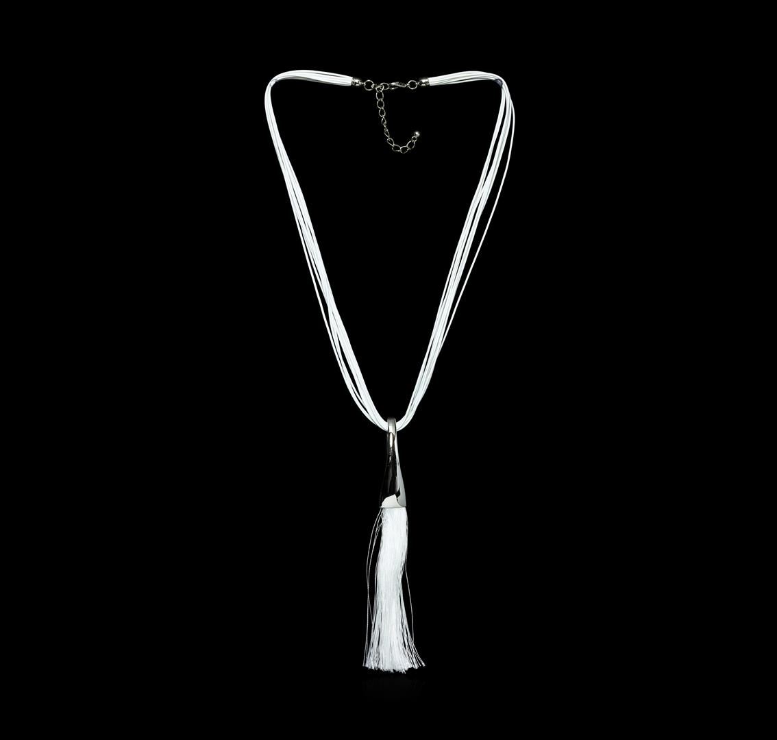 High end designer jewelry. Silk Tassel Leather Necklace - Rhodium Plated. Rhodium Plated Metal/3" Ext Clasp. White/ Silver. 28/7.5inches. Total Weight: 55 grams.