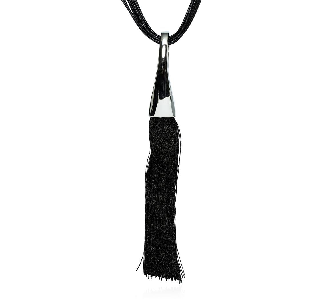 High end designer jewelry. Silk Tassel Leather Necklace - Rhodium Plated. Rhodium Plated Metal/3" Ext Clasp. Black/ Silver. 28/7.5inches. Total Weight: 55.5 grams.