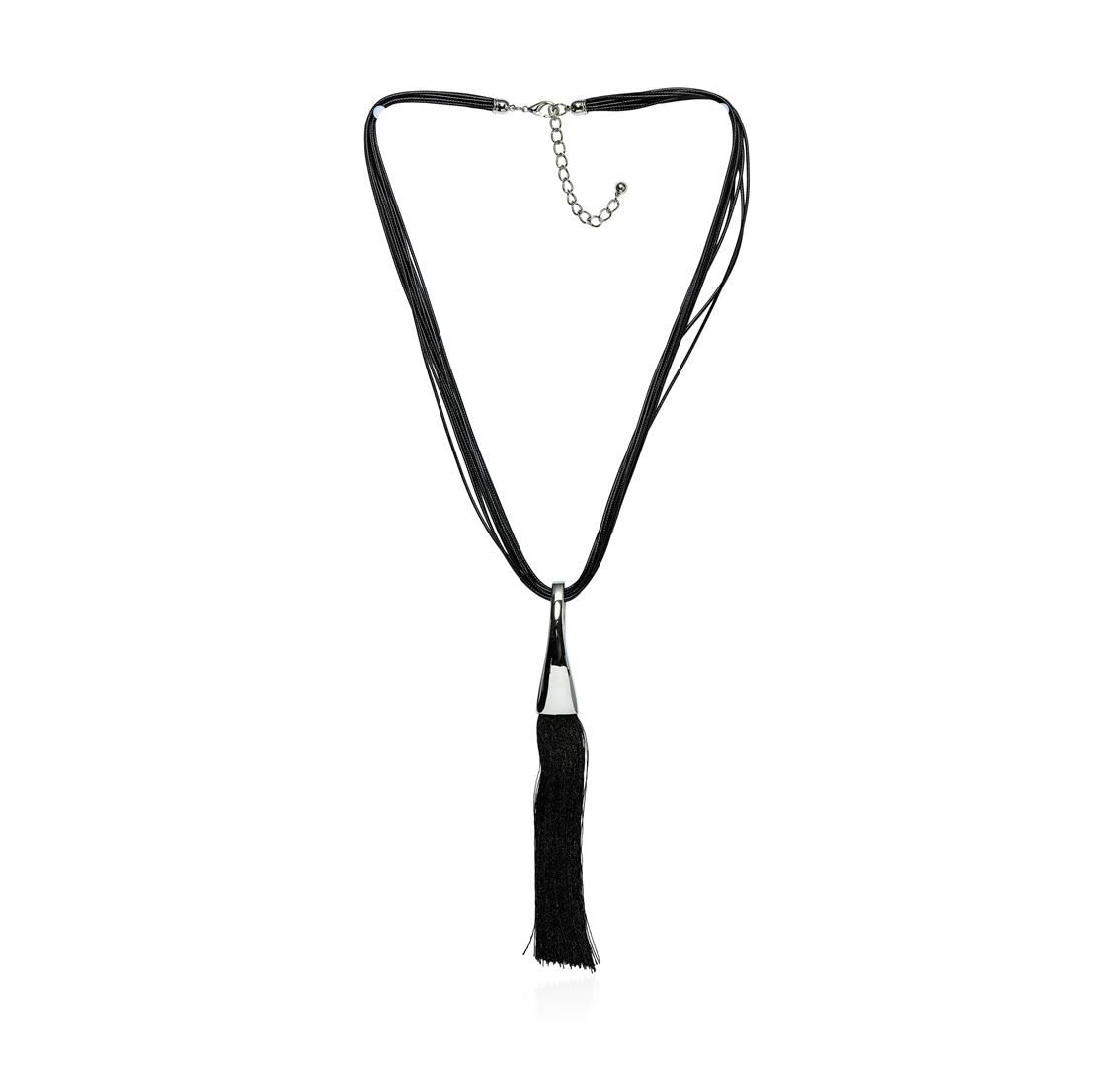 High end designer jewelry. Silk Tassel Leather Necklace - Rhodium Plated. Rhodium Plated Metal/3" Ext Clasp. Black/ Silver. 28/7.5inches. Total Weight: 55.5 grams.
