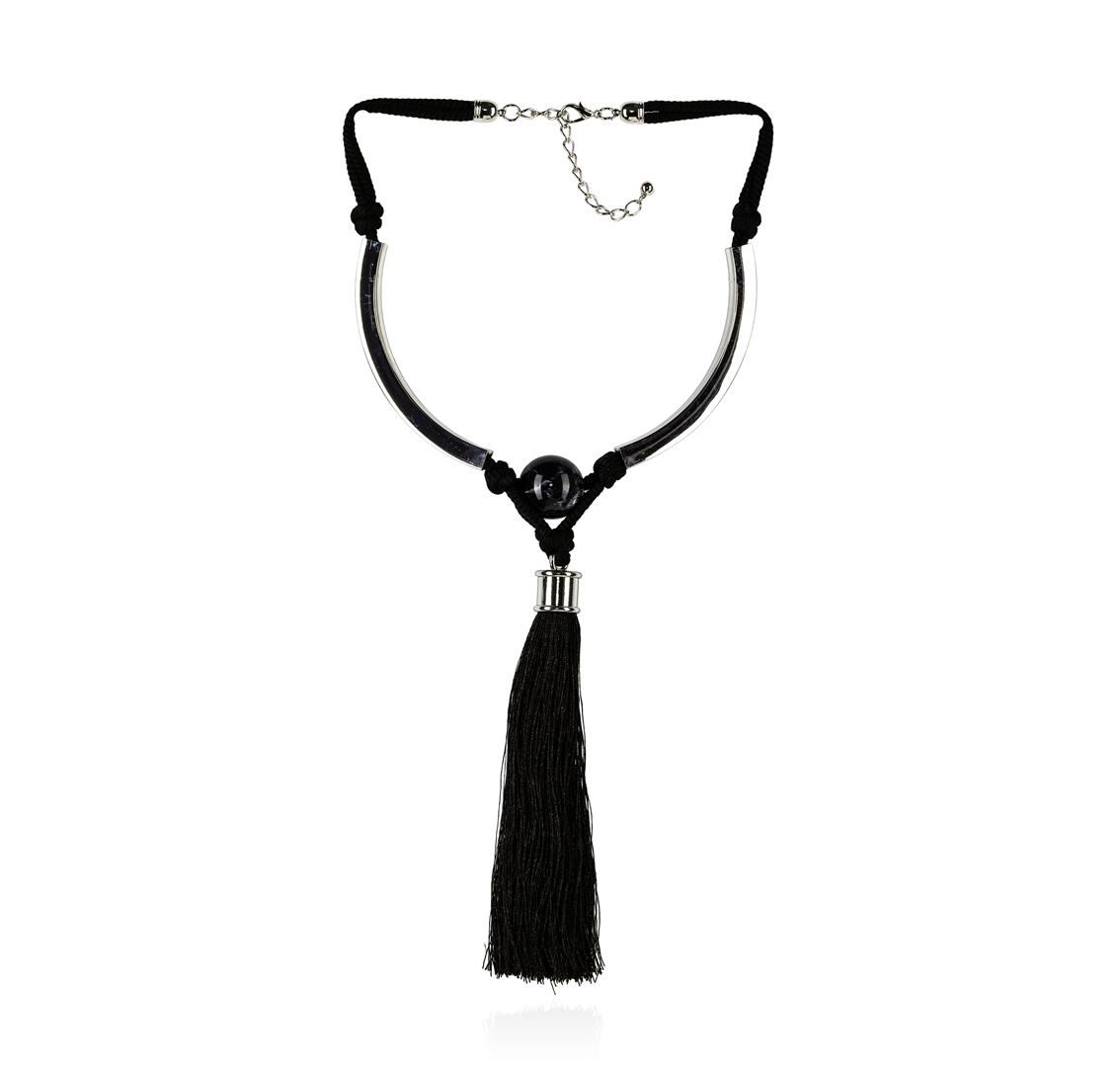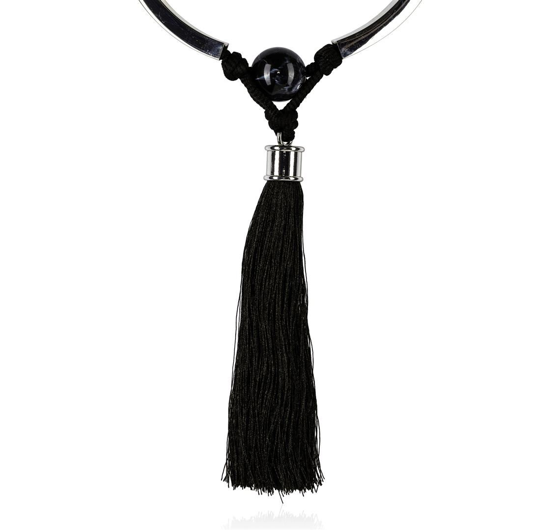 High end designer jewelry. Silk Tassel Pendant Necklace - Rhodium Plated. Rhodium Plated Metal/3.5" Ext Clasp. Black/ Silver. 20/8inches. Total Weight: 116.1 grams.