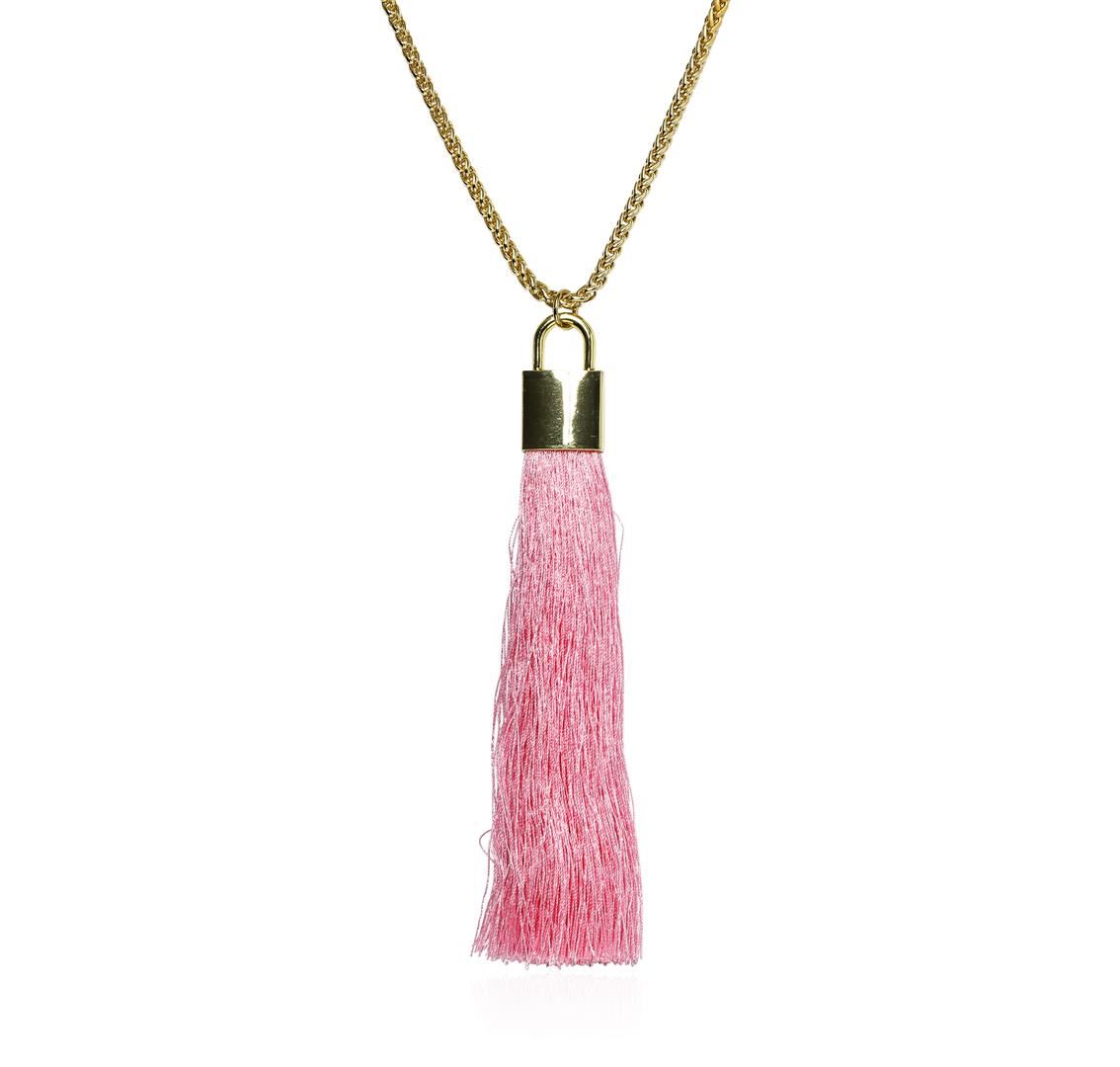 High end designer jewelry. Silk Tassel Square Pendant Necklace - Gold Plated. Gold Plated Metal/3" Ext Clasp. Pink/ Gold. 28/6inches. Total Weight: 59.3 grams.