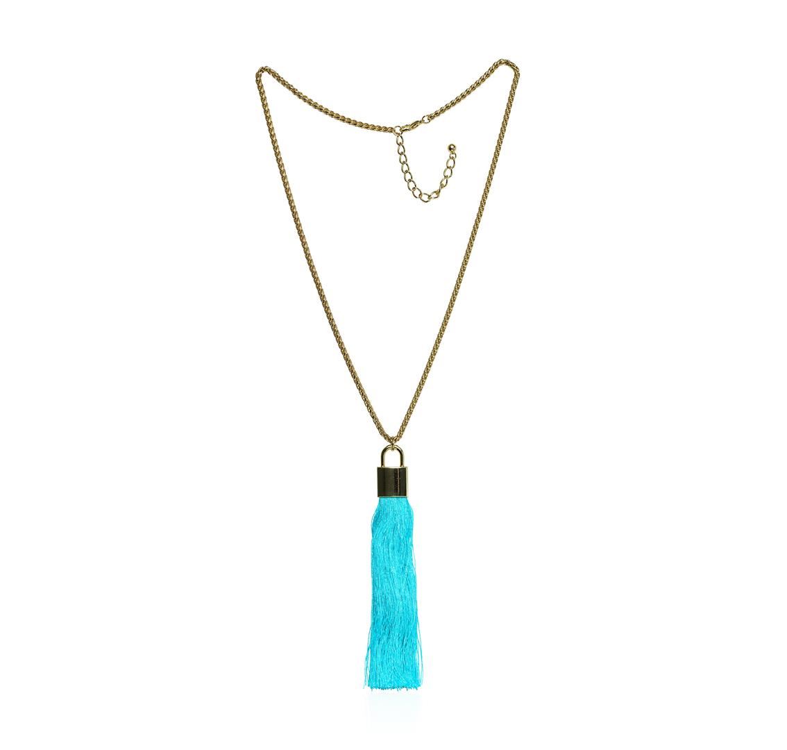High end designer jewelry. Silk Tassel Square Pendant Necklace - Gold Plated. Gold Plated Metal/3" Ext Clasp. Aqua/ Gold. 28/6inches. Total Weight: 57.8 grams.