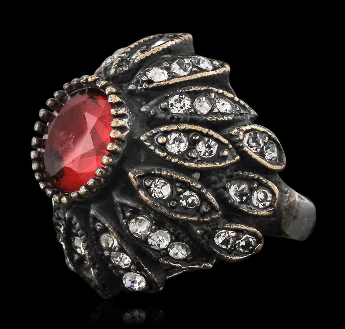 One electronically tested silver lab created multi gemstone ring. The ring features a lab created red crystal set within a cubic zirconia encrusted bombe style curvature, completed by a four millimeter wide band. Bright and anodized finish with yellow gold accents. Identified with markings of "925". Condition is new, good workmanship. Containing: One bezel set round brilliant cut laboratory created red crystal, measuring 10.00 - 10.00 x 5.80 mm, approximate weight of 1.45ct., clarity is eye clean, dark, very slightly brownish, orangy red color, (GIA oR 7/3), cut is good. Transmitting light with no distortion, transparent. Graded in the setting. Forty-eight prong set round brilliant cut laboratory created cubic zirconias, measuring 2.30 - 2.20 x 1.46 mm, approximate total weight of 4.32ct., clarity is eye clean, colorless, very slightly grayish, white color, (GIA W 0/3), cut is good. Transmitting light with no distortion, transparent. Color grade is an average for the group. Graded in the setting. Total Weight of Colored Stones 5.77ct. Total Weight of Ring 14.06gm. AIG Appraised at $1,080.00. AIG Appraised at $1,080.00.