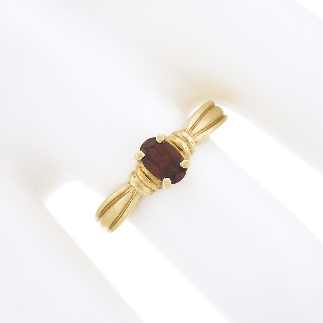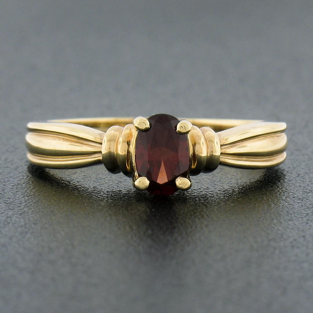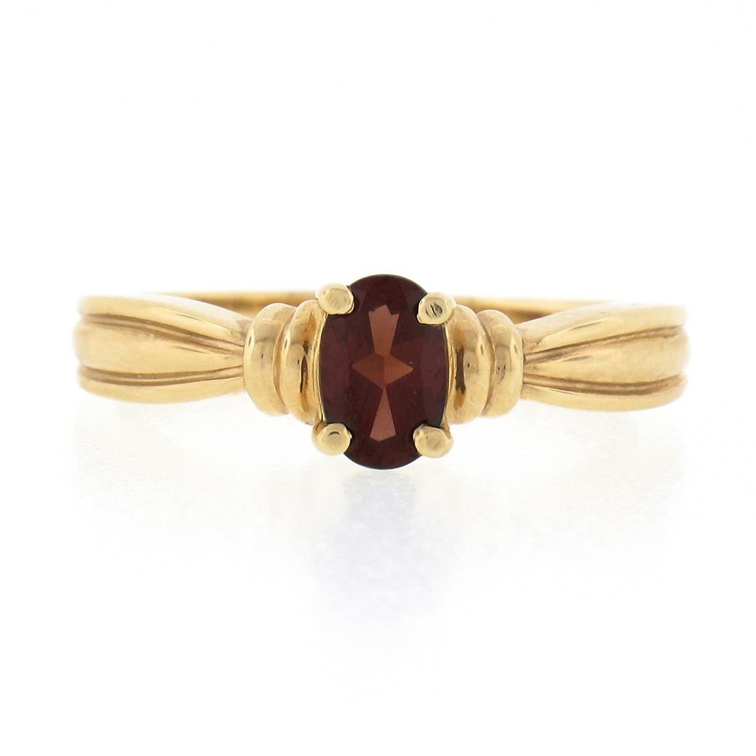 A solid 14k yellow gold solitaire ring, with 1 oval cut natural garnet (4x6mm). The ring is size 6.0, weighs a total of 2.88 grams, and measures 6mm wide.