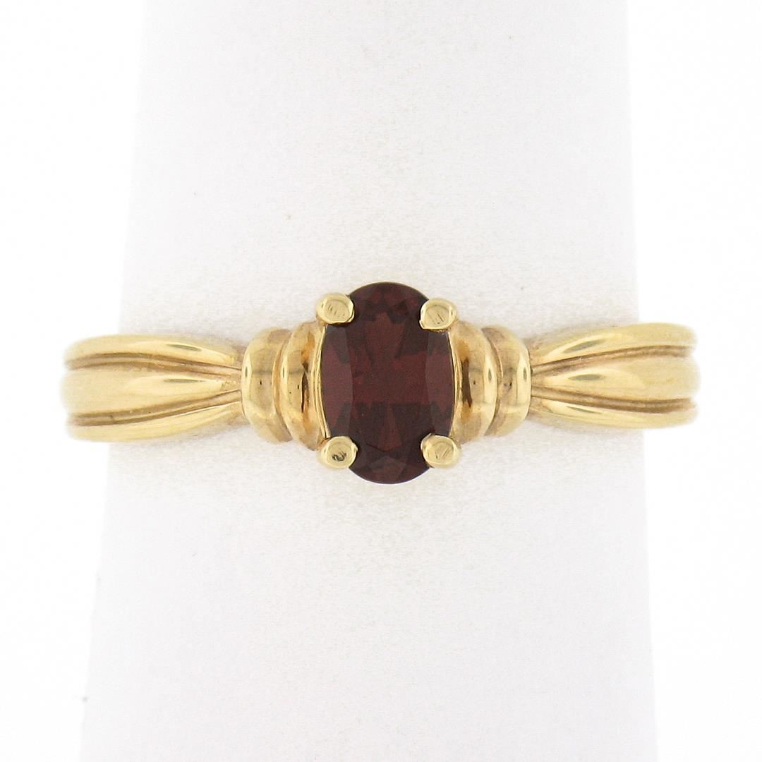 A solid 14k yellow gold solitaire ring, with 1 oval cut natural garnet (4x6mm). The ring is size 6.0, weighs a total of 2.88 grams, and measures 6mm wide.