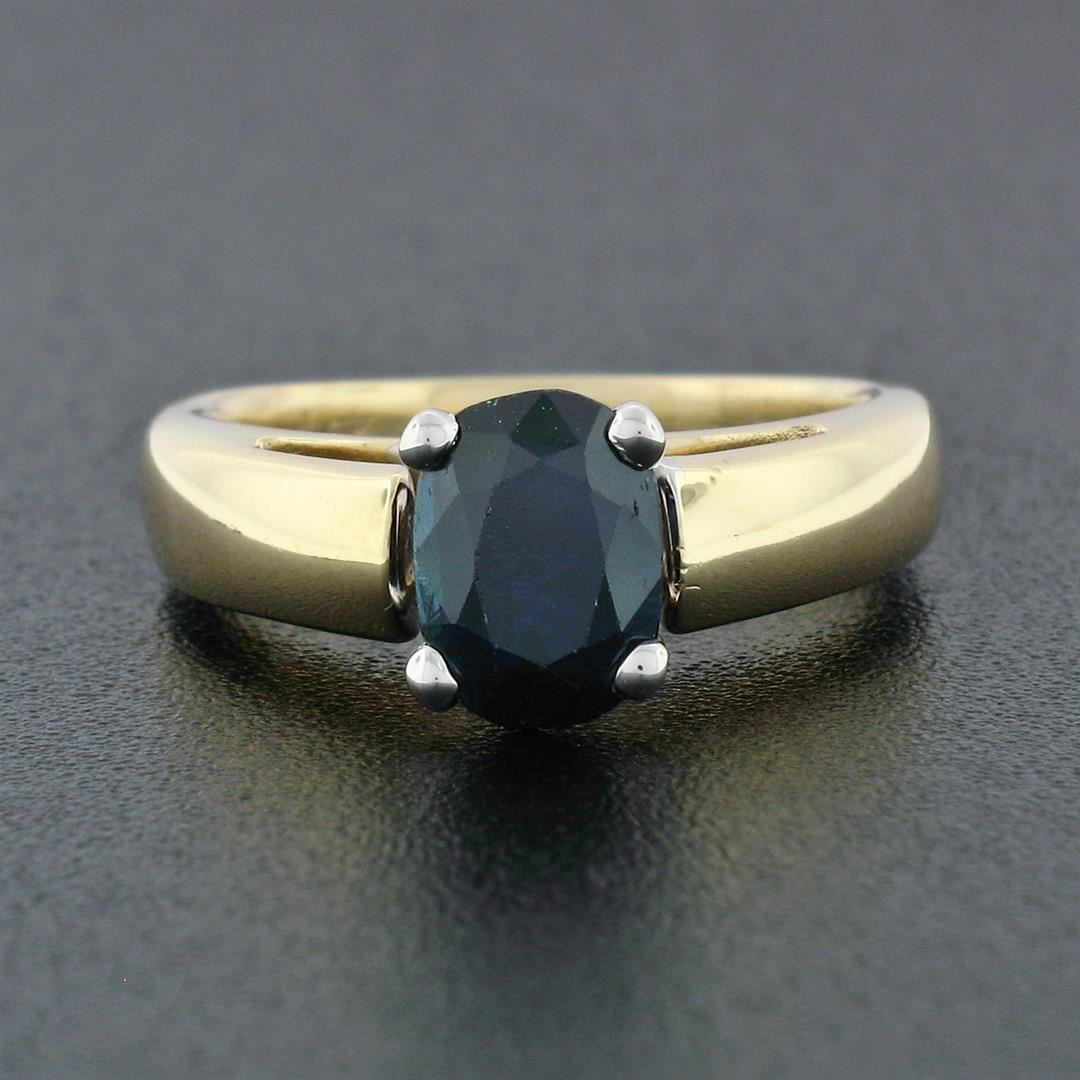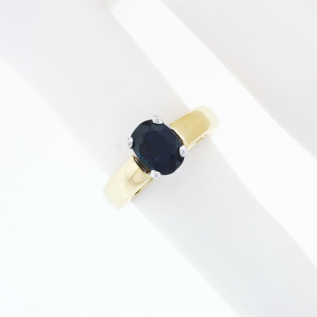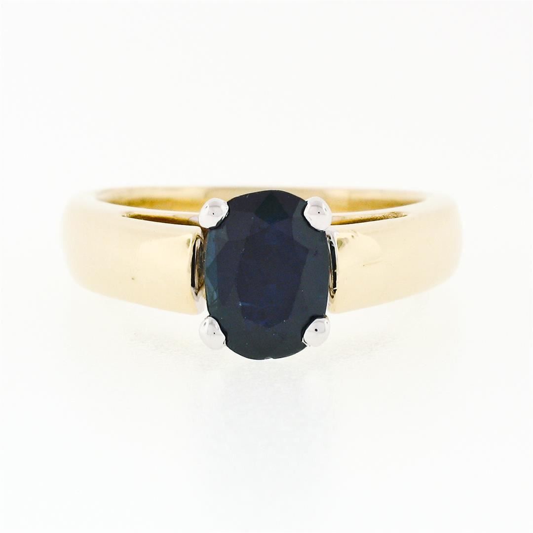 A solid 14k two tone gold engagement ring with 1 oval cut sapphire solitaire (7x5.15mm - 1.16ct). The ring is size 2.5, weighs a total of 4.28 grams, and measures 7.08mm wide.