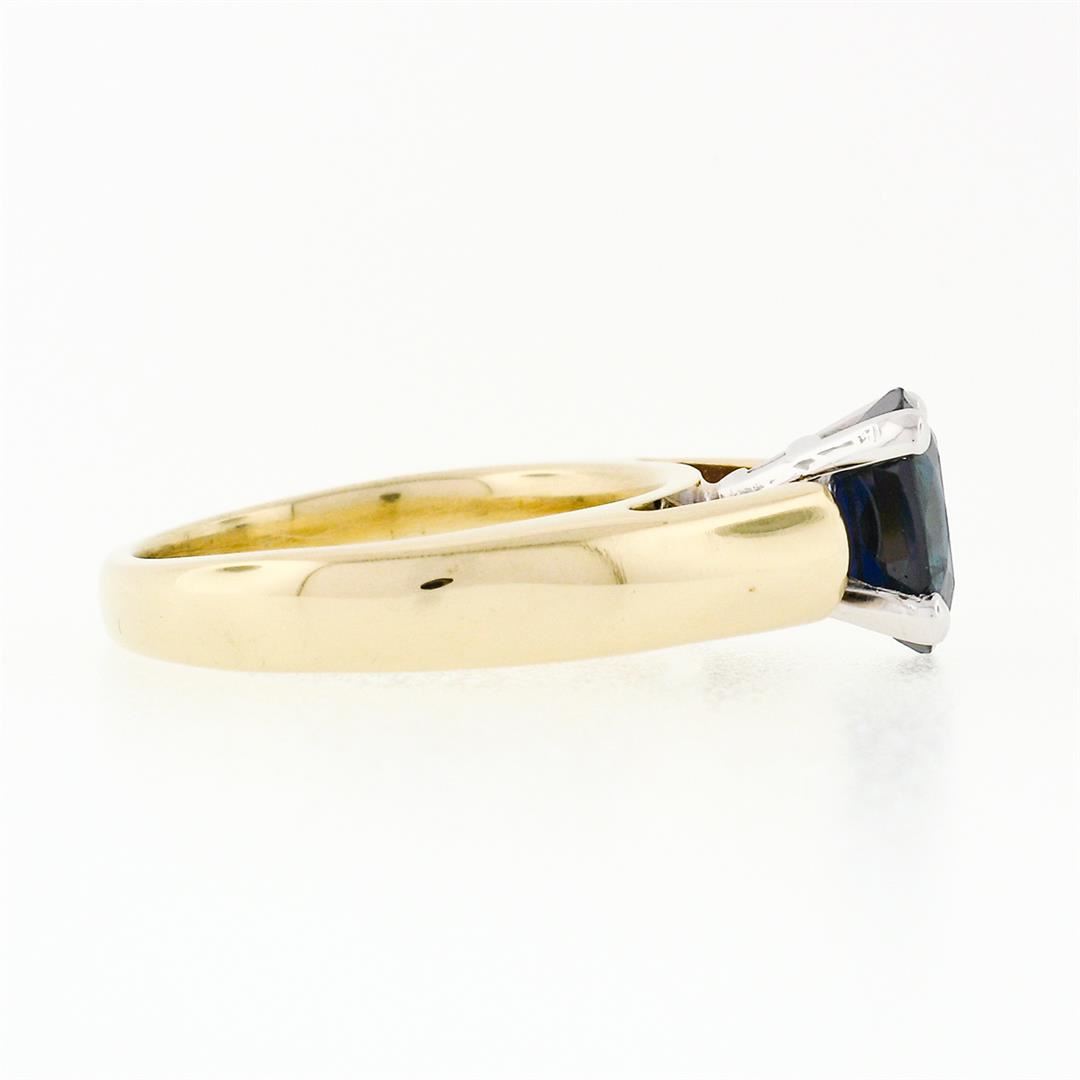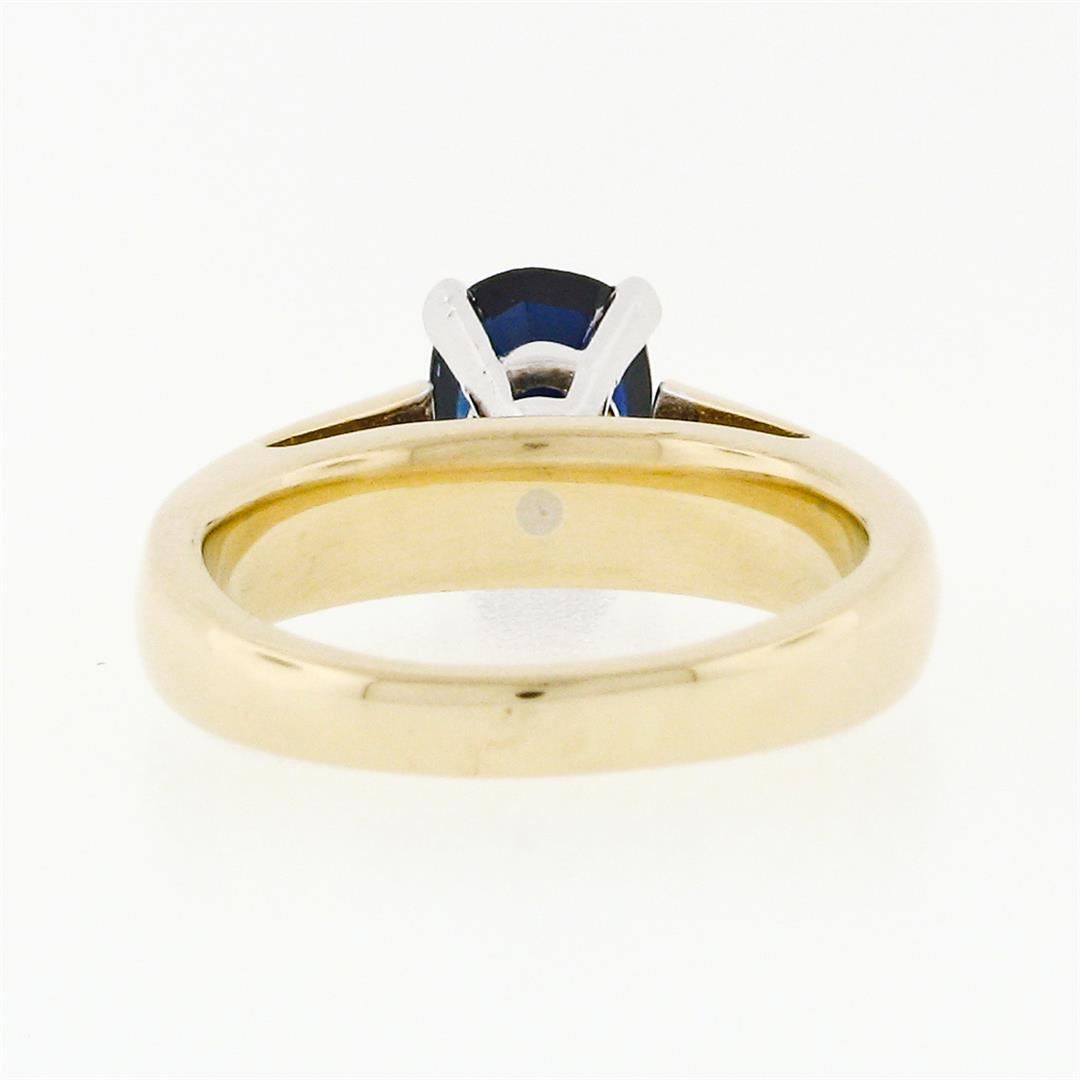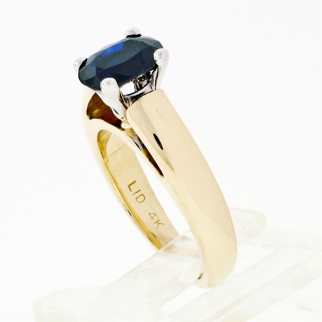 A solid 14k two tone gold engagement ring with 1 oval cut sapphire solitaire (7x5.15mm - 1.16ct). The ring is size 2.5, weighs a total of 4.28 grams, and measures 7.08mm wide.