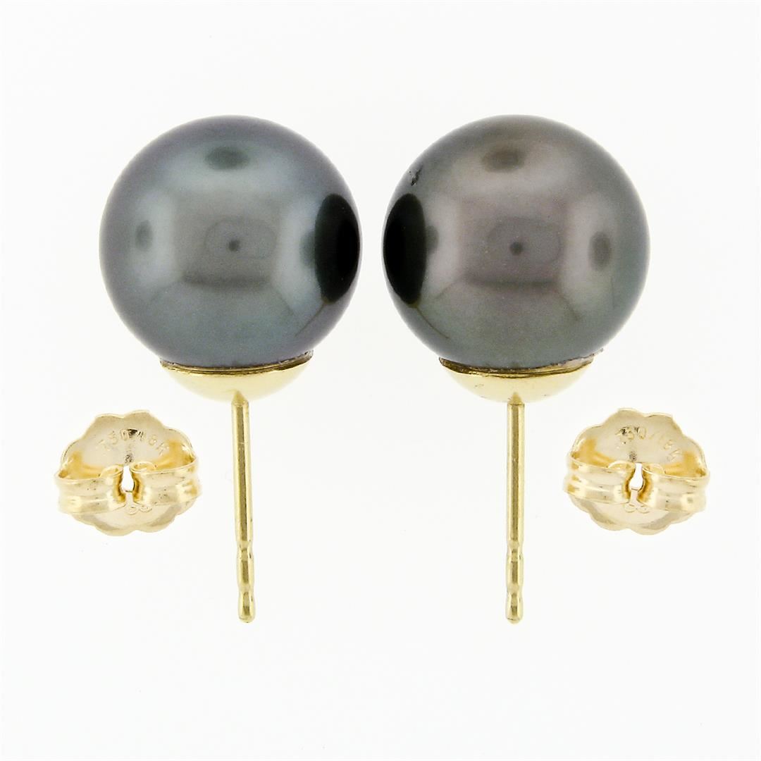 A solid 18k yellow gold stud earrings, with 2 round shape natural tahitian pearls (10.75mm and 10.90mm). The earrings measure approximately 10.75mm to 10.90mm in diameter and weigh a total of 4.51 grams.