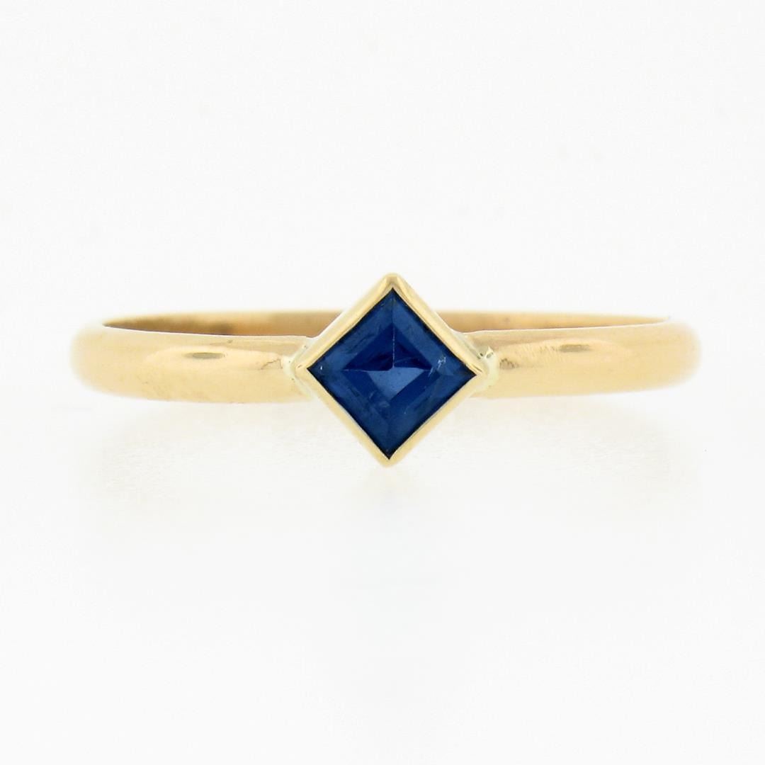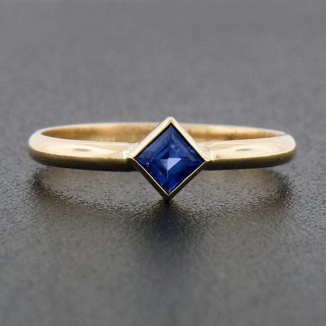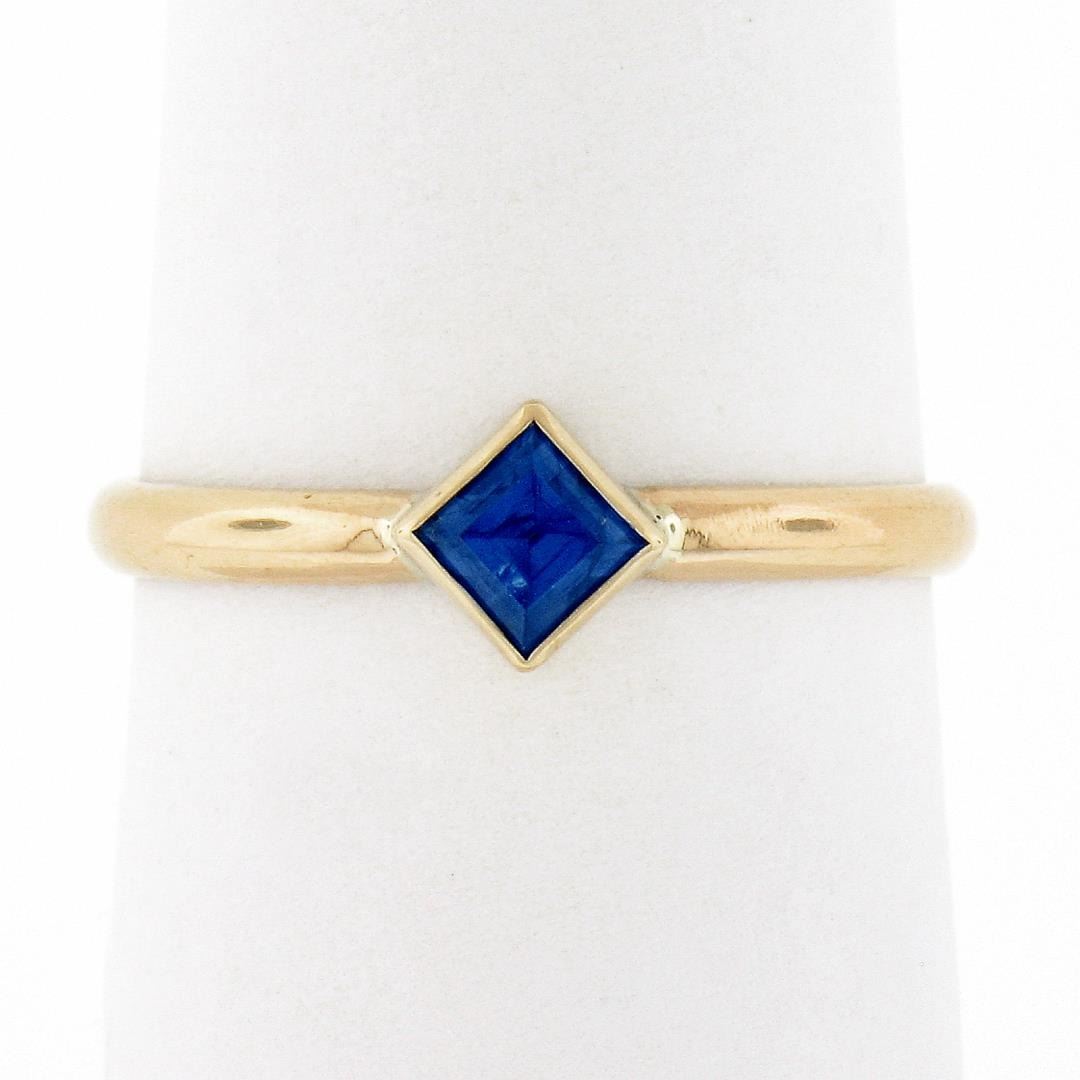 A solid 14k yellow gold solitaire ring, with 1 square cut natural sapphire (0.32ct). The ring is size 6.0, weighs a total of 1.26 grams, and measures 5.5mm wide.