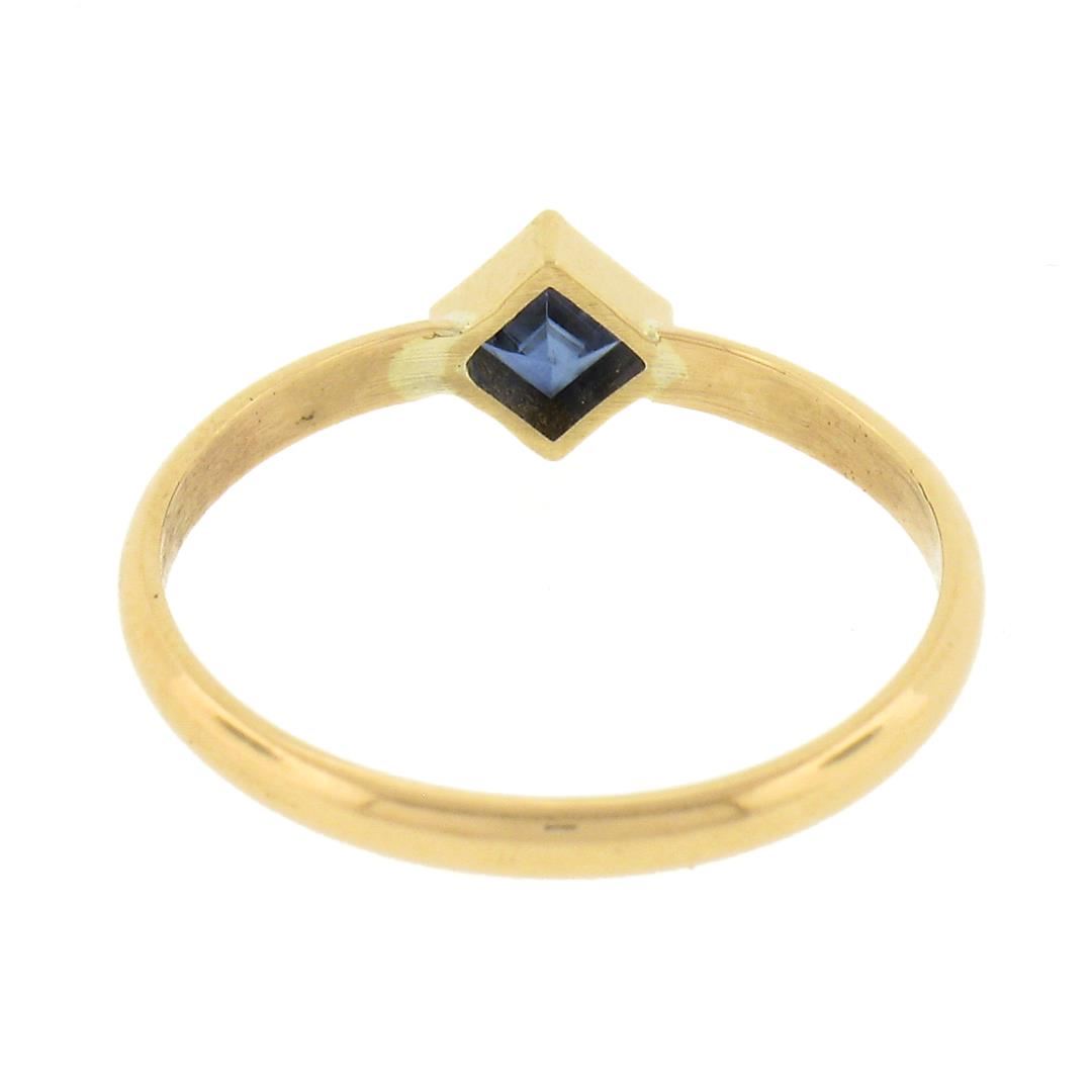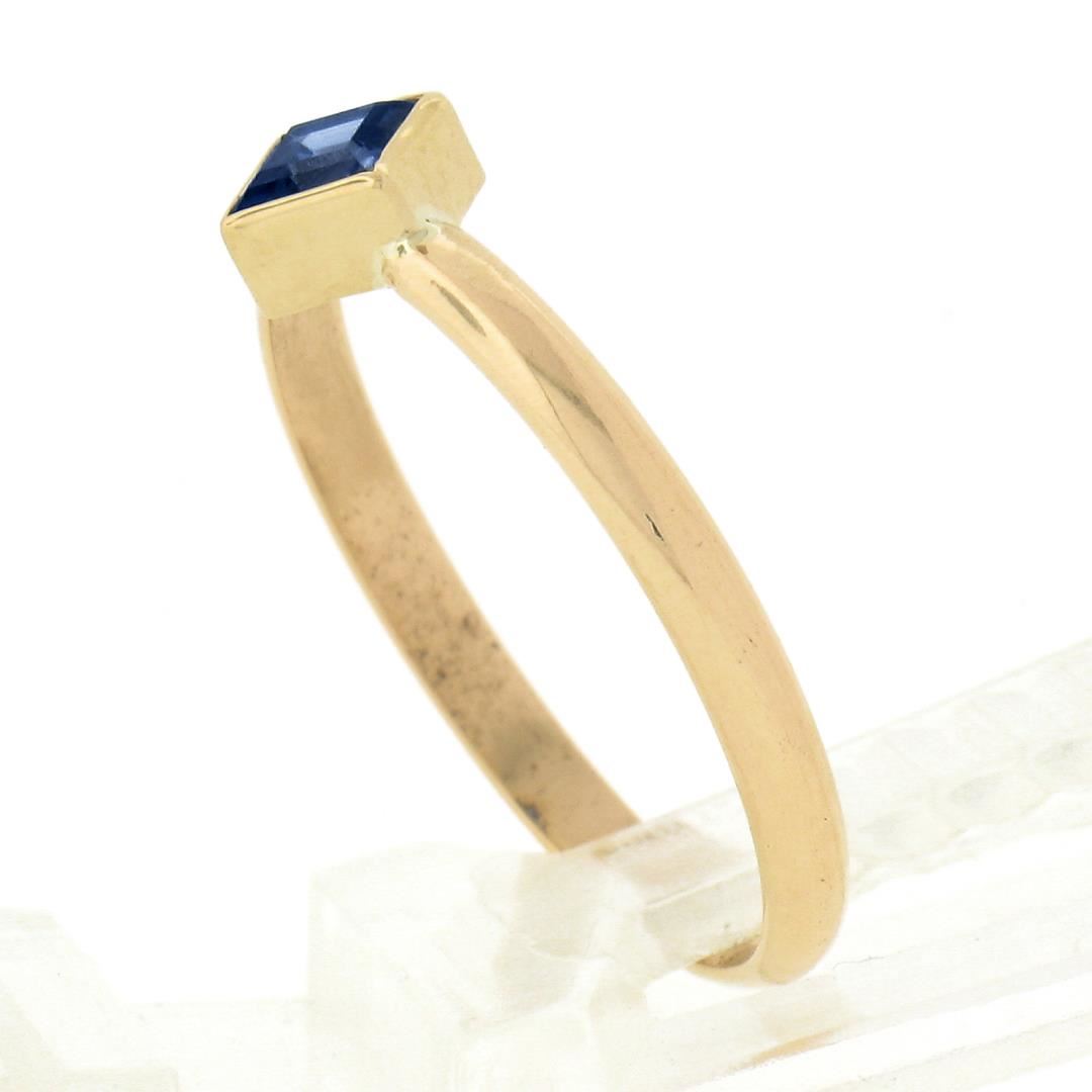 A solid 14k yellow gold solitaire ring, with 1 square cut natural sapphire (0.32ct). The ring is size 6.0, weighs a total of 1.26 grams, and measures 5.5mm wide.