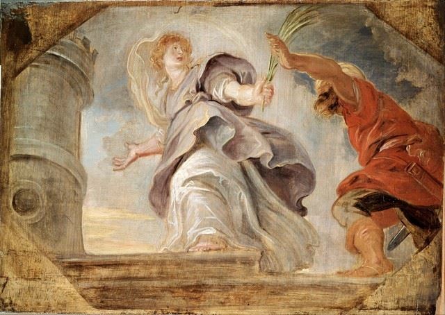 Artist: Sir Peter Paul Rubens - Title: Saint Barbara Fleeing from her Father - Medium: Fine Art Reproduction Giclee on Canvas - Image Size: Approximately 22.75 inches x 32 inches - Unframed on Unstretched Canvas - Biography: Sir Peter Paul Rubens (28 June 1577 - 30 May 1640) was a Flemish artist and diplomat from the Duchy of Brabant in the Southern Netherlands (modern-day Belgium) who lived during the Dutch Golden Age. He is considered the most influential artist of the Flemish Baroque tradition. Sir Peter Paul Rubens's highly charged compositions reference erudite aspects of classical and Christian history. His unique and immensely popular Baroque style emphasized movement, colour, and sensuality, which followed the immediate, dramatic artistic style promoted in the Counter-Reformation. Sir Peter Paul Rubens was a painter producing altarpieces, portraits, landscapes, and history paintings of mythological and allegorical subjects. He was also a prolific designer of cartoons for the Flemish tapestry workshops and of frontispieces for the publishers in Antwerp.