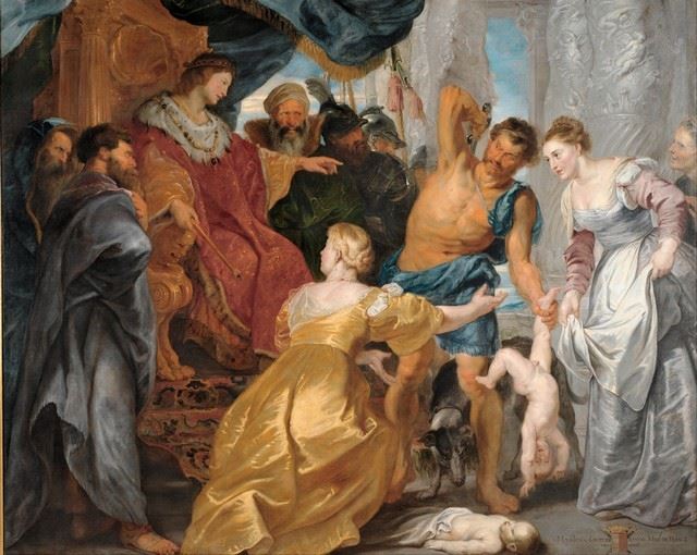 Artist: Sir Peter Paul Rubens - Title: The Judgement of Solomon - Medium: Fine Art Reproduction Giclee on Canvas - Image Size: Approximately 25.5 inches x 32 inches - Unframed on Unstretched Canvas - Biography: Sir Peter Paul Rubens (28 June 1577 - 30 May 1640) was a Flemish artist and diplomat from the Duchy of Brabant in the Southern Netherlands (modern-day Belgium) who lived during the Dutch Golden Age. He is considered the most influential artist of the Flemish Baroque tradition. Sir Peter Paul Rubens's highly charged compositions reference erudite aspects of classical and Christian history. His unique and immensely popular Baroque style emphasized movement, colour, and sensuality, which followed the immediate, dramatic artistic style promoted in the Counter-Reformation. Sir Peter Paul Rubens was a painter producing altarpieces, portraits, landscapes, and history paintings of mythological and allegorical subjects. He was also a prolific designer of cartoons for the Flemish tapestry workshops and of frontispieces for the publishers in Antwerp.
