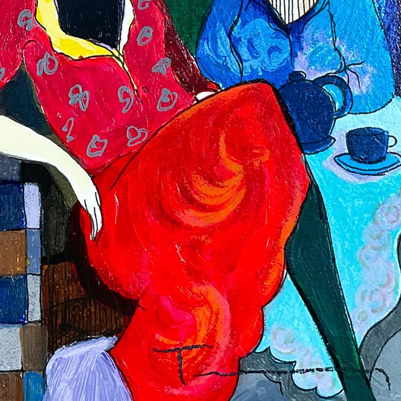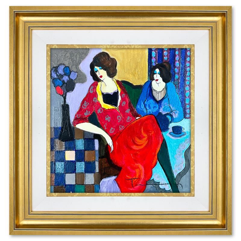 "Sisters" is a one-of-a-kind mixed media over paint on wood by Itzchak Tarkay (1935-2012), hand signed by the artist. This piece comes custom framed. Includes Letter of Authenticity. Measures approx. 17.5" x 17" (frame), 9.5" x 9" (image).