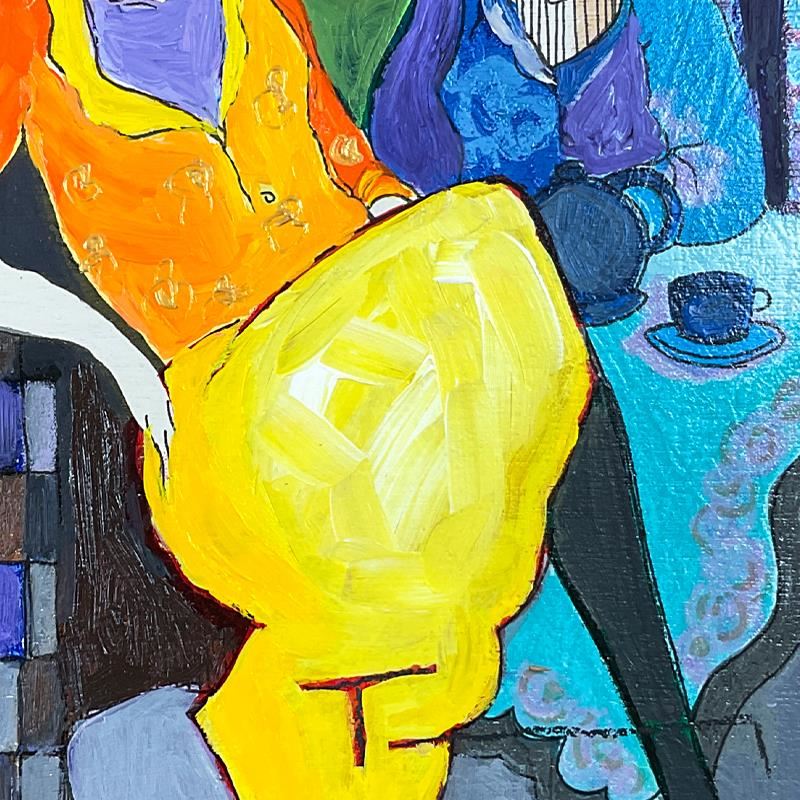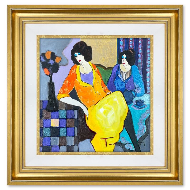 "Sisters" is a one-of-a-kind mixed media over paint on wood by Itzchak Tarkay (1935-2012), hand signed by the artist. This piece comes custom framed. Includes Letter of Authenticity. Measures approx. 17.5" x 17" (frame), 9.5" x 9" (image). This item requires special handling and may have a longer than usual turnaround.