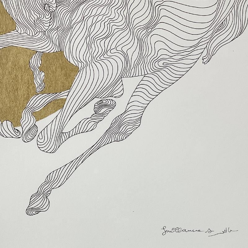 "Sketch H" is an original pen and ink drawing on paper with hand laid goldleaf by Guillaume Azoulay, hand signed by the artist. This piece comes custom framed. Includes Letter of Authenticity. Measures approx. 25" x 22" (frame), 16" x 13" (image).