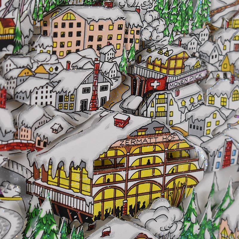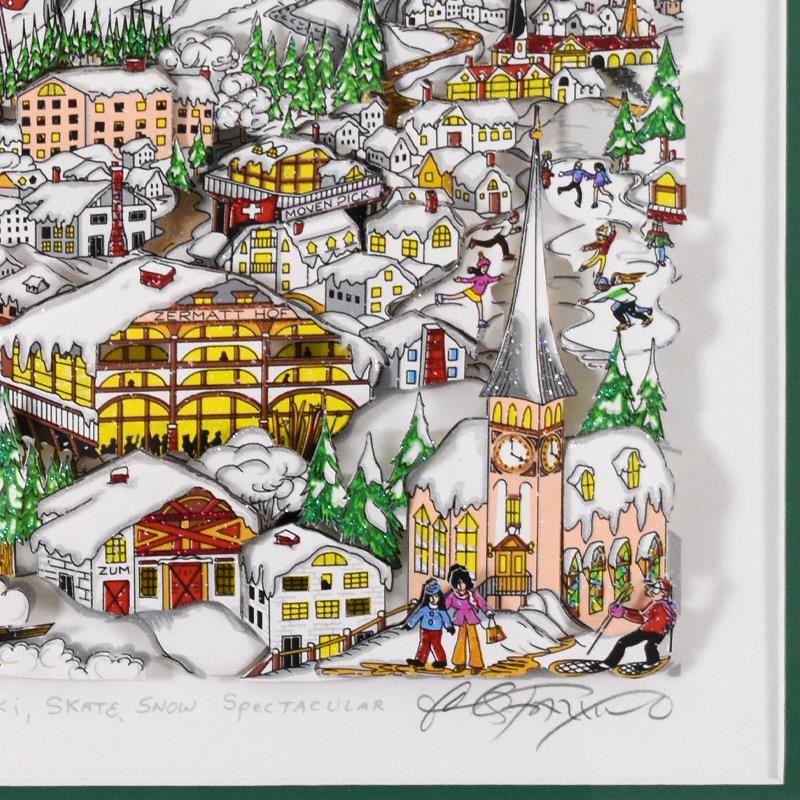 "Ski, Skate, Snow...Spectacular (Green)" is a 3D limited edition silk screen construct on paper by Charles Fazzino, numbered and hand signed by the artist. This piece comes custom framed. Includes Certificate of Authenticity. Measures approximately 17.5" x 19" (framed), 11" x 13" (image).