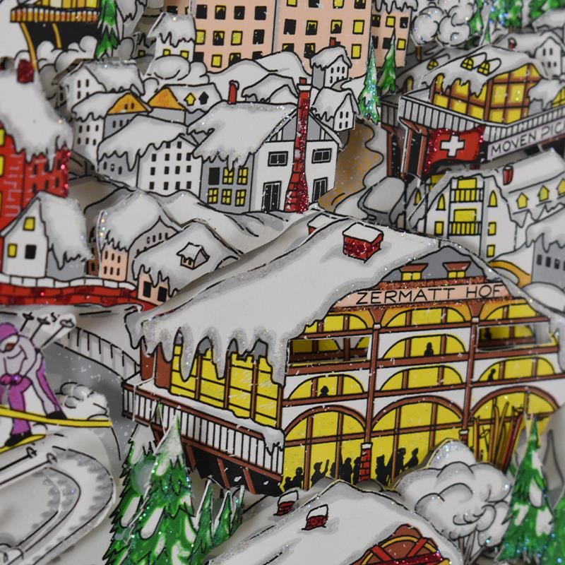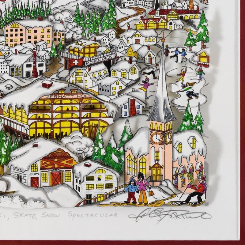 "Ski, Skate, Snow...Spectacular (Red)" is a 3D limited edition silk screen construct on paper by Charles Fazzino, numbered and hand signed by the artist. This piece comes custom framed. Includes Certificate of Authenticity. Measures approximately 17.5" x 19" (framed), 11" x 13" (image).