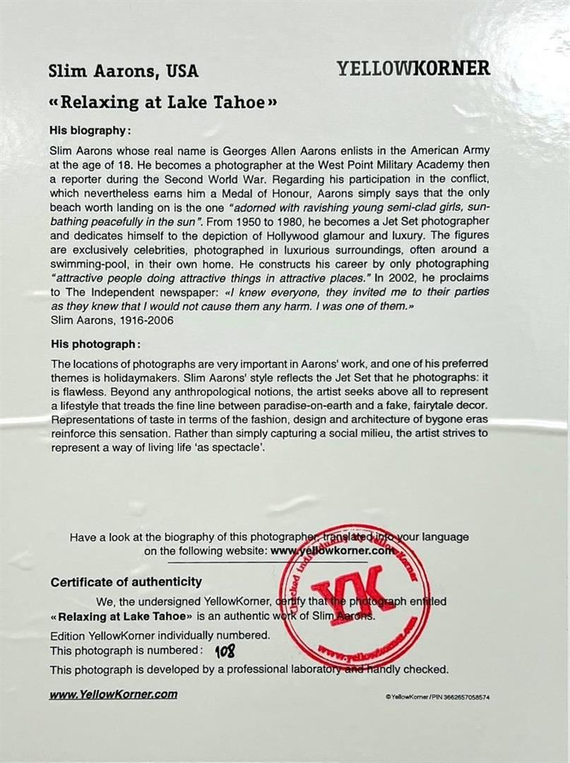Slim Aaron Sunbathing and Relaxing At lake Tahoe Nevada YellowKorner Certified Photograph. Certificate of Authenticity from YellowKorner affixed to the back. Matted Dimensions 16"x20". Protected with Clear Mylar Sleeve.
