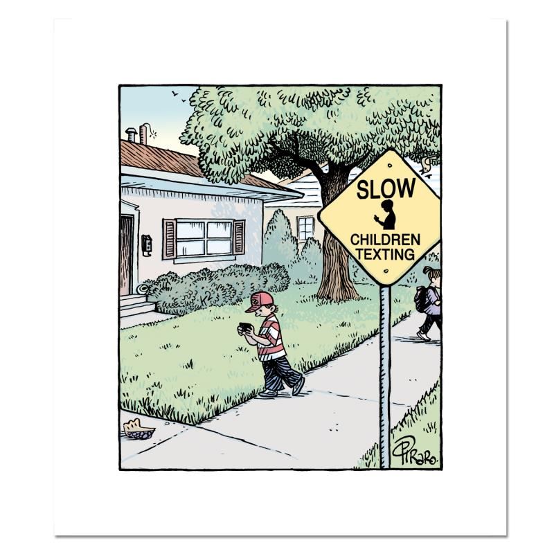 "Slow Children" is a limited edition giclee on paper by Dan Piraro, creator of the critically acclaimed and award winning comic strip, Bizarro! This piece is numbered and hand signed by the artist and includes a letterof authenticity. Measures approximtely 8" x 15" (image).