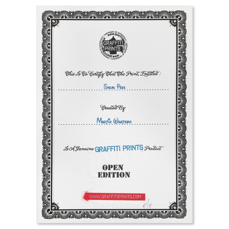 "Sneak Peek" is a silkscreen on paper by Martin Whatson bearing the artist's embossed initials. This piece comes custom framed. The Certificate of Authenticity is notated PP. Measures approx. 30.5" x 16" (frame), 24.5" x 10" (image).