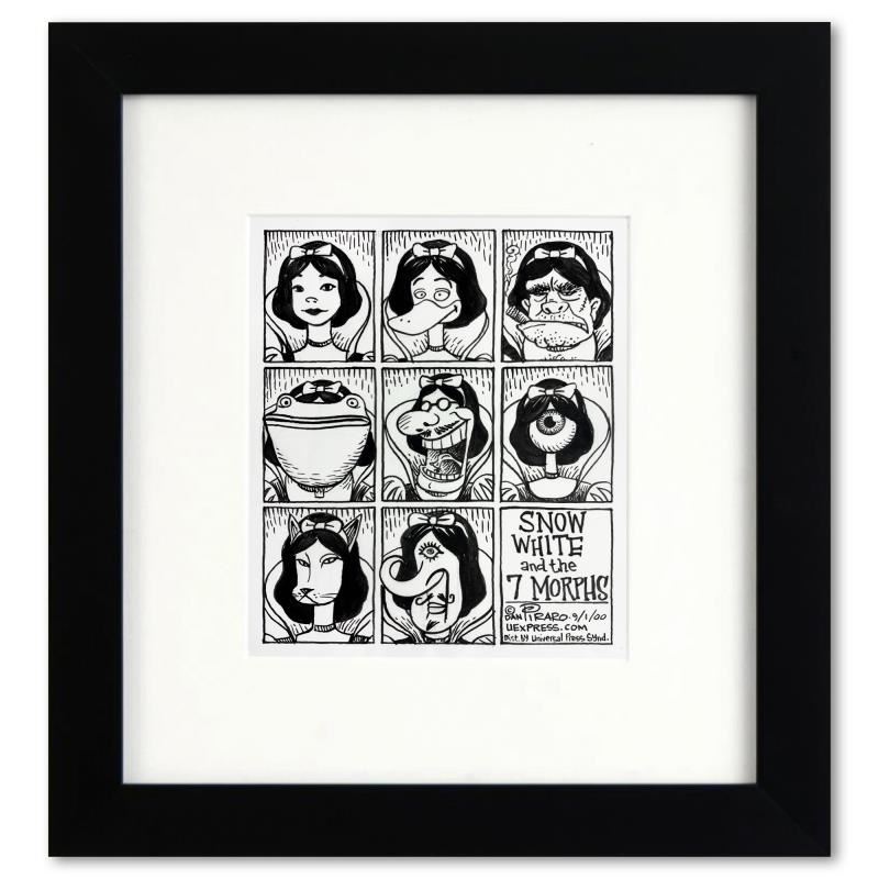 Enter a surreal and satirical world of twisted imagination and award winning creativity. "Snow White and the 7 Morphs" is an original pen & ink drawing on paper by Dan Piraro, creator of the critically acclaimed and award winning comic strip, Bizarro. This piece is hand signed, comes custom framed and includes a letter of authenticity. Measures approximately 12" x 11" (frame), 7" x 6" (image).This item requires special handling and may have a longer than usual turnaround.