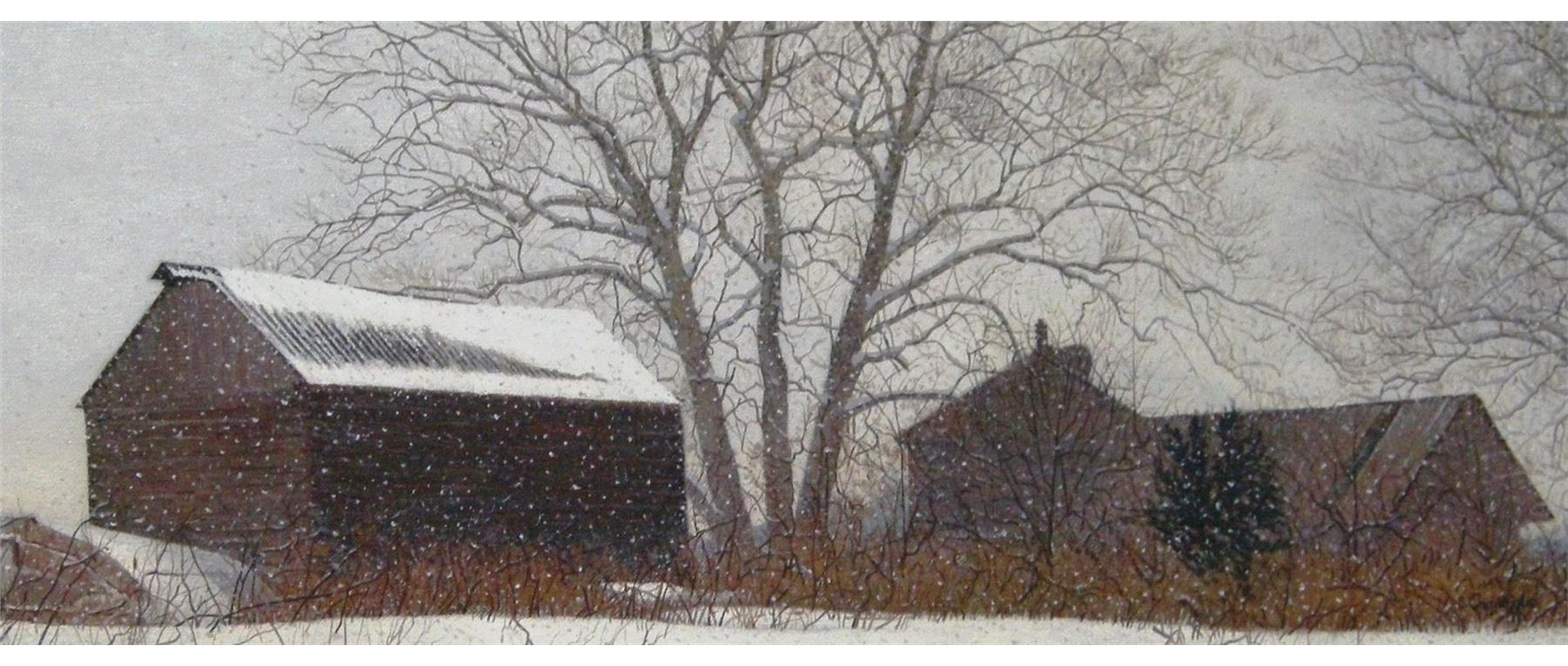 Snowfall by Sergei Chaplygin is a framed original oil on canvas showing two houses in the bleak winter. Size is 29" x 49 1/2".