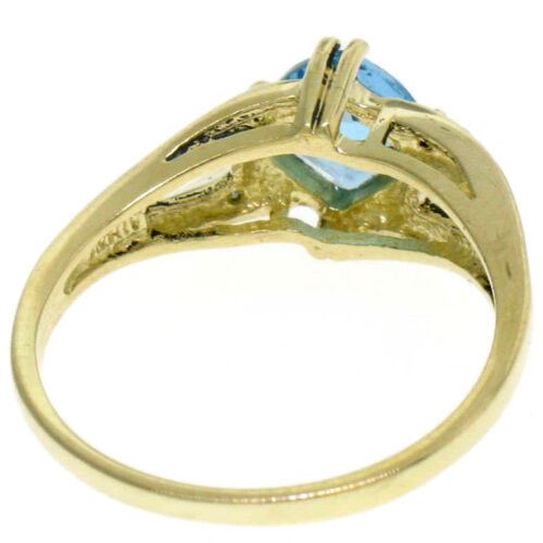 Solid 10k Yellow Gold Checkerboard Cushion Blue Topaz Ring w/ Diamond Accents. Please see photos and description for all available information. An estate solid 10k yellow gold solitaire ring, featuring 1 square cushion checkerboard cut natural topaz (6.1x6.0mm - 0.75ct), accented with 2 round brilliant cut natural diamonds (H- SI2; 0.02ctw). The ring is size 7.0, weighs a total of 2.7 grams, and measures 8.30mm wide.