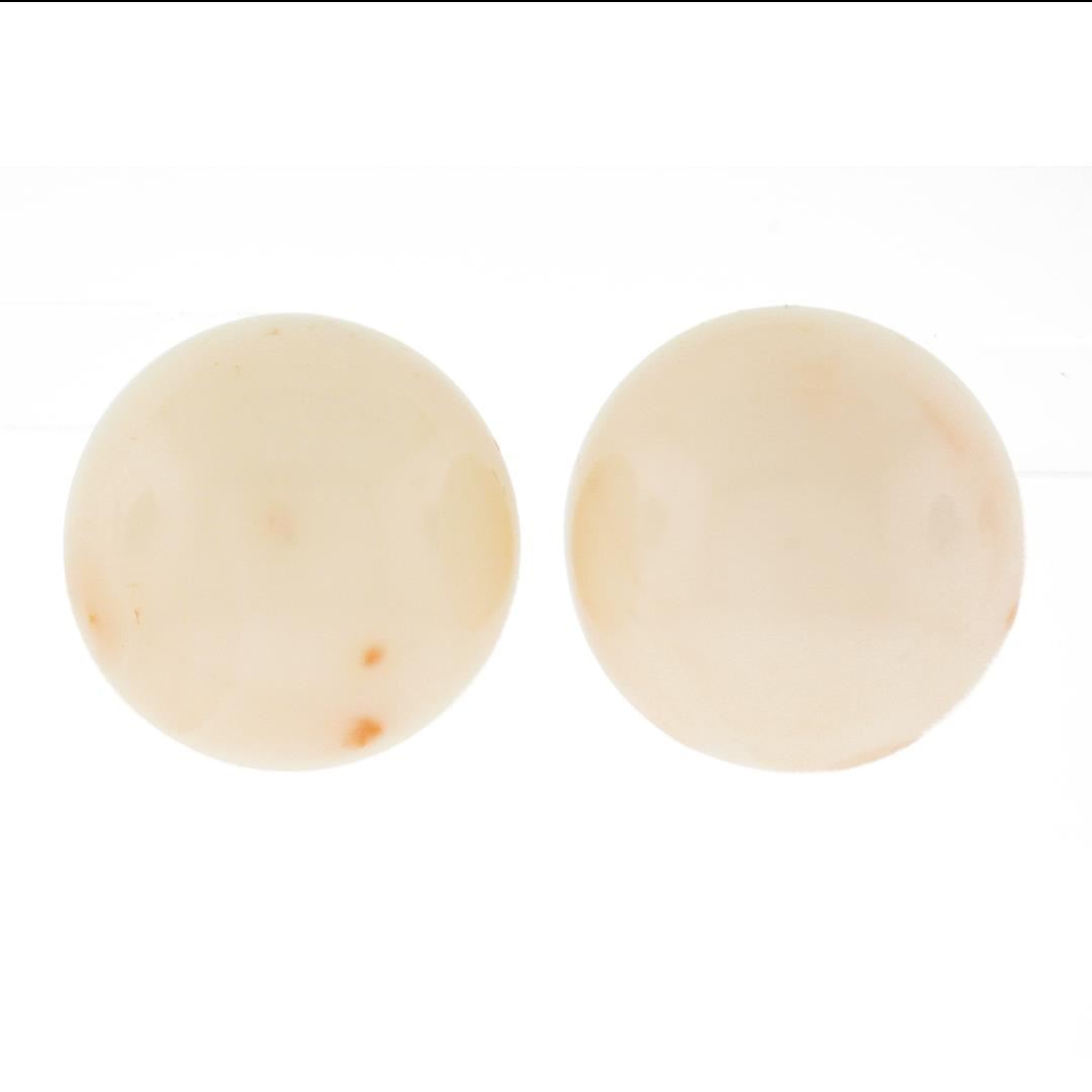 A solid 14k yellow gold button stud earrings, with 2 bead ball natural coral (15mm). The earrings measure approximately 15mm in diameterand weigh a total of 8.20 grams.