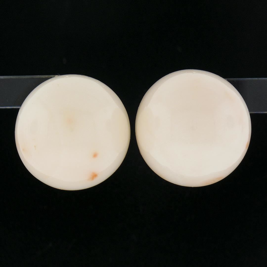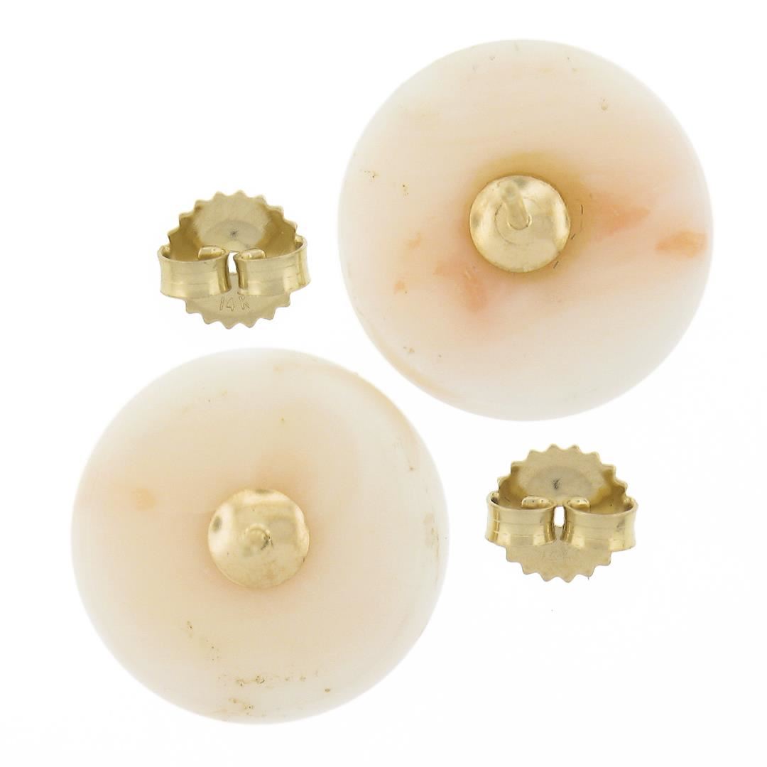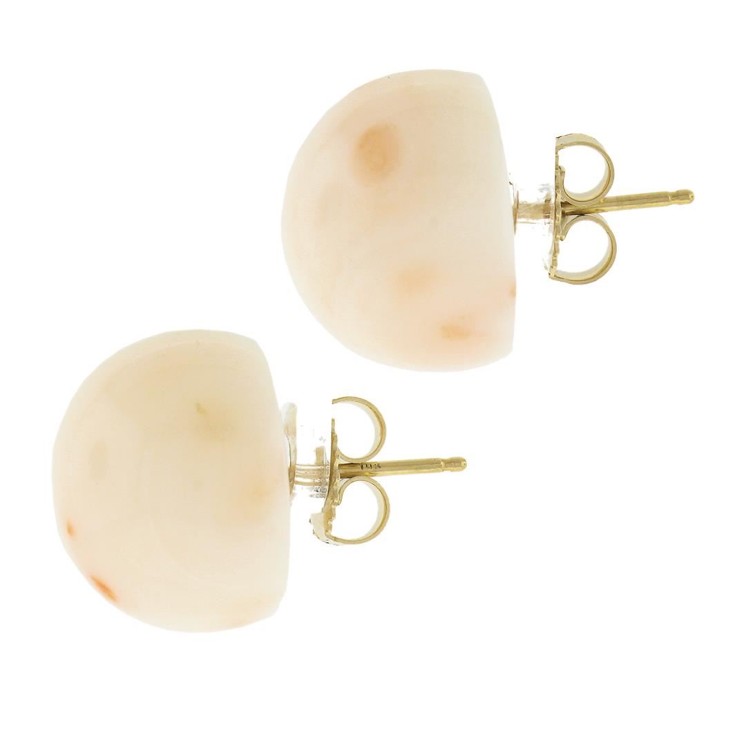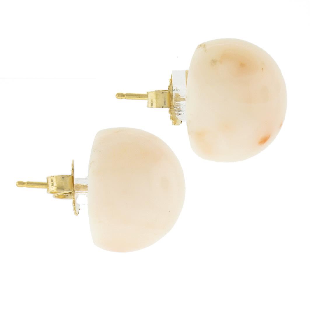A solid 14k yellow gold button stud earrings, with 2 bead ball natural coral (15mm). The earrings measure approximately 15mm in diameterand weigh a total of 8.20 grams.