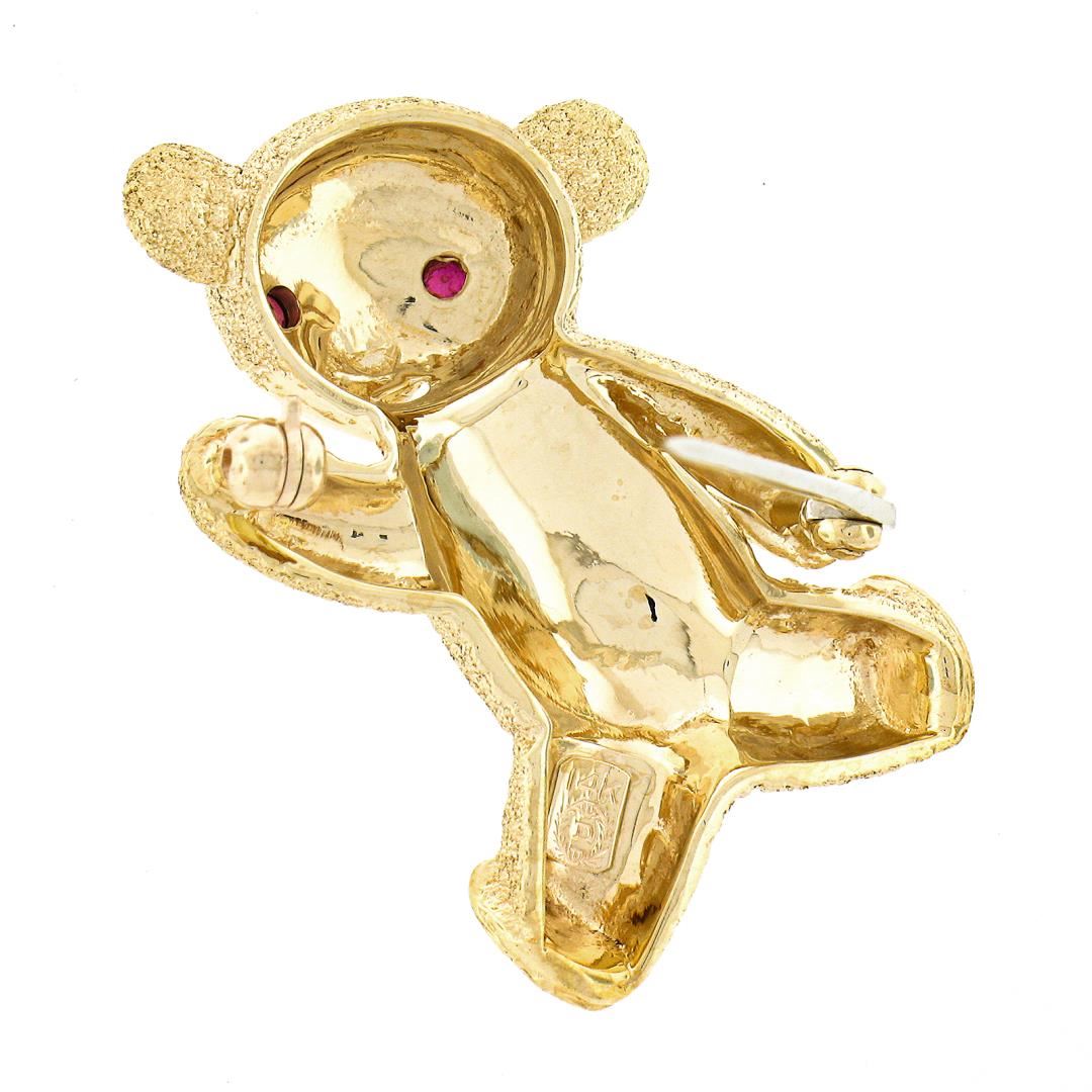 A solid 14k yellow gold bear brooch, with 2 round brilliant cut natural rubies (0.04ctw). Measures 32.10x20.70mm and weighs a total of 7.74 grams.