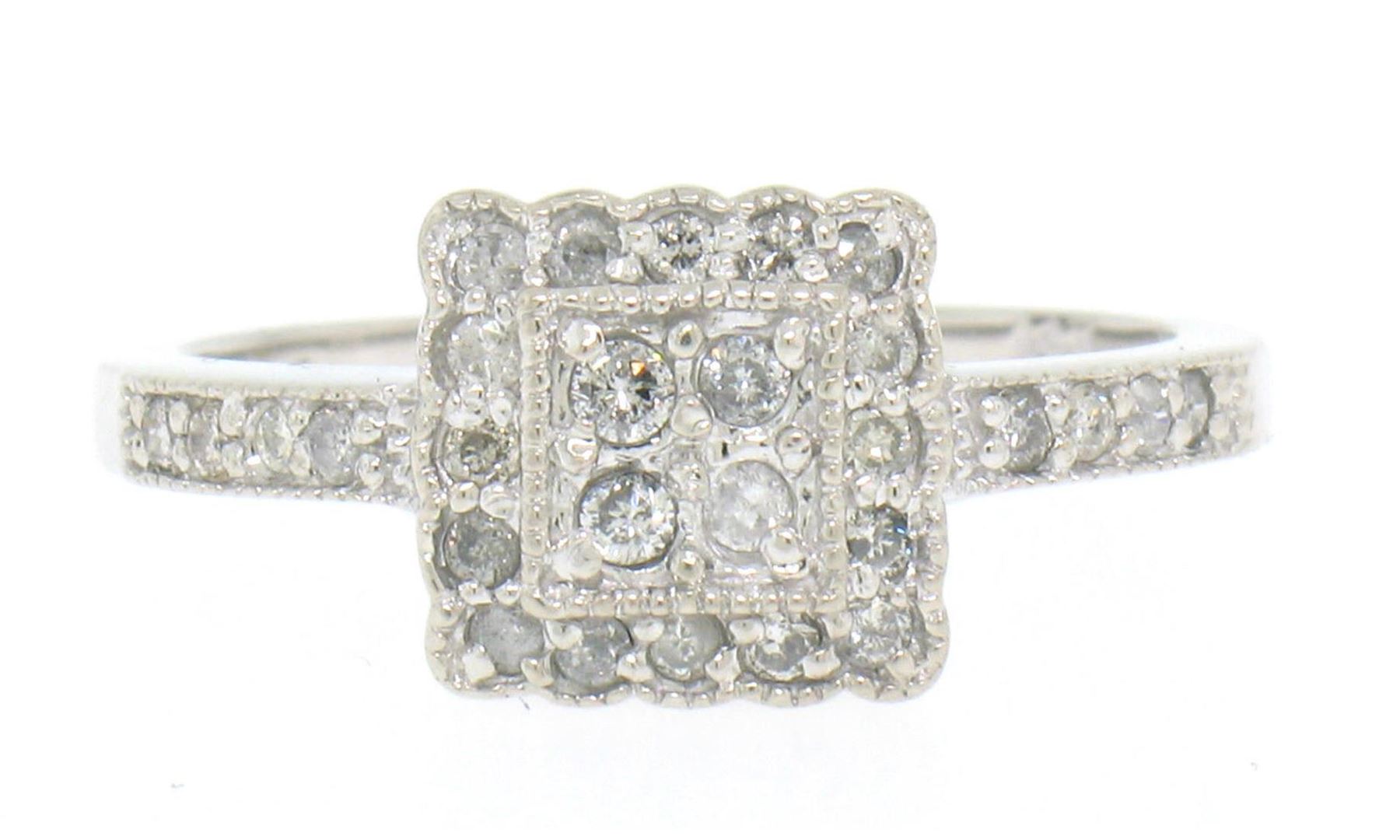 An estate solid 14k white gold square cluster ring, with 28 round brilliant cut natural diamonds (H- I1/I2; 0.50ctw). The ring is size 9.0, weighs a total of 3.6 grams, and measures 10.43mm wide.