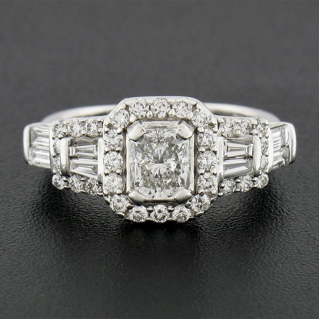A solid 14k white gold engagement ring, with 1 radiant cut natural diamond (H - I1 ; 0.79ct), and numerous of baguette, round & radiant cut natural diamonds (G/H - SI1-I1 ; 0.67ctw). The ring is size 4.5, weighs a total of 4.82 grams, and measures 9.7mm wide.