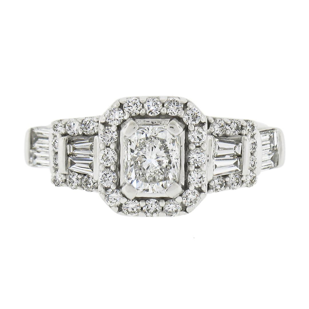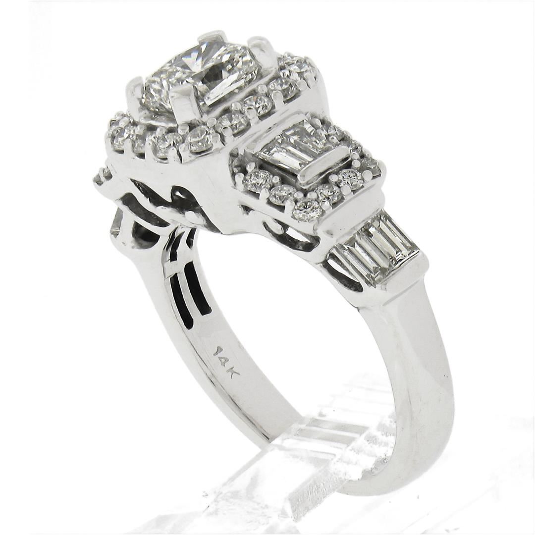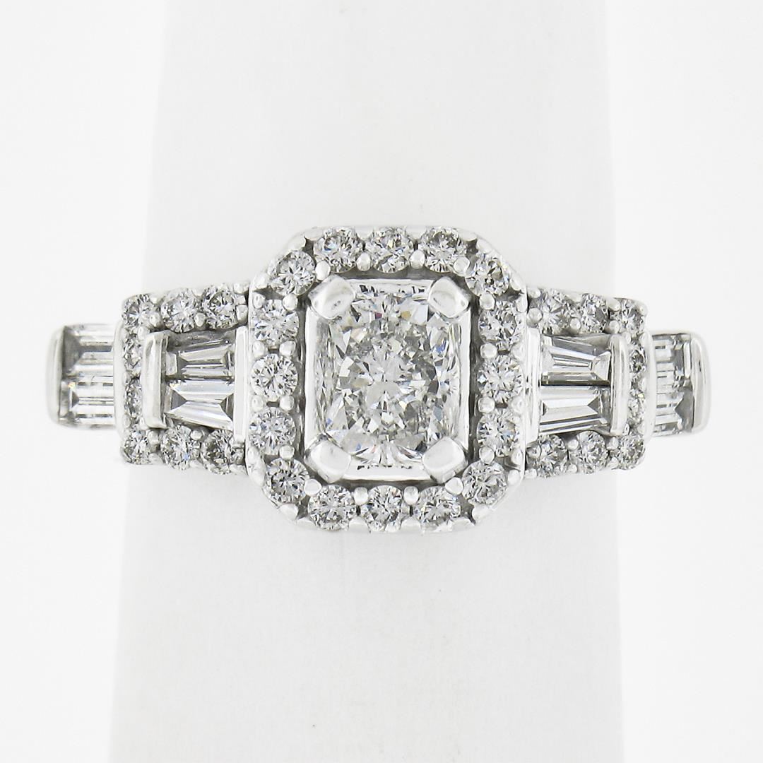 A solid 14k white gold engagement ring, with 1 radiant cut natural diamond (H - I1 ; 0.79ct), and numerous of baguette, round & radiant cut natural diamonds (G/H - SI1-I1 ; 0.67ctw). The ring is size 4.5, weighs a total of 4.82 grams, and measures 9.7mm wide.