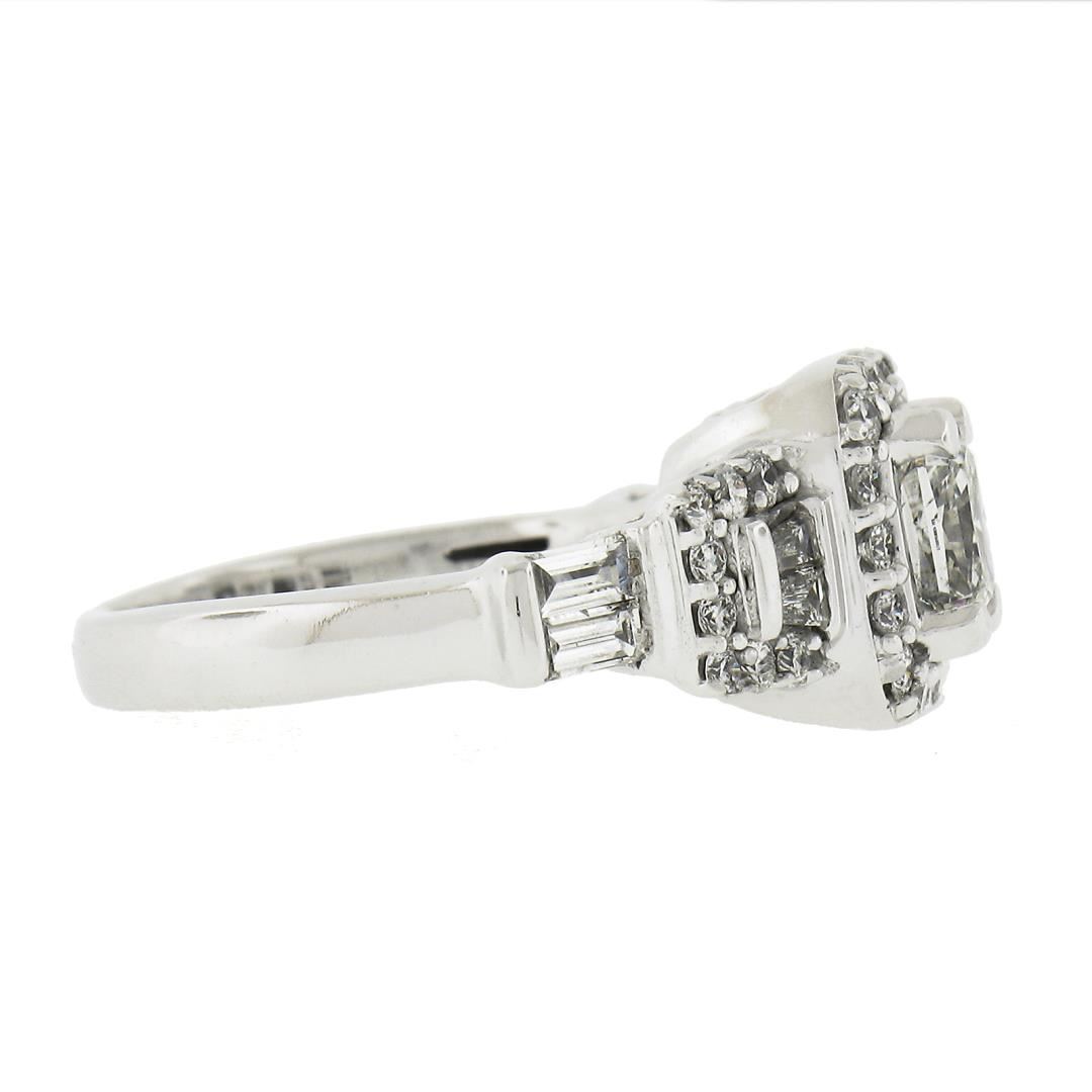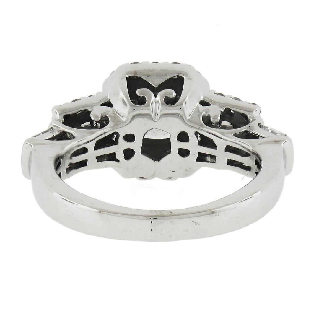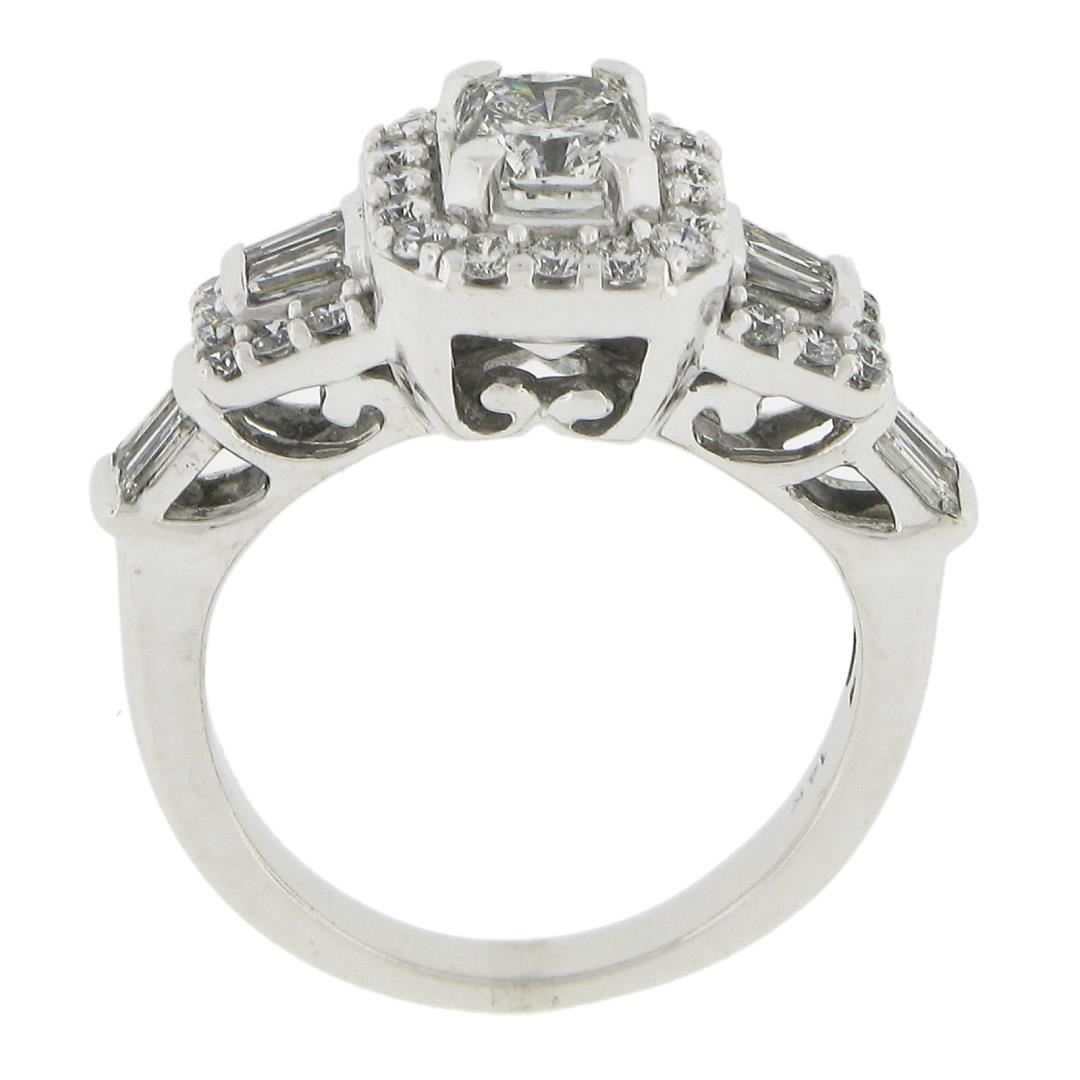 A solid 14k white gold engagement ring, with 1 radiant cut natural diamond (H - I1 ; 0.79ct), and numerous of baguette, round & radiant cut natural diamonds (G/H - SI1-I1 ; 0.67ctw). The ring is size 4.5, weighs a total of 4.82 grams, and measures 9.7mm wide.