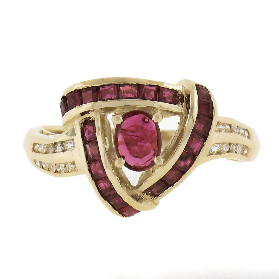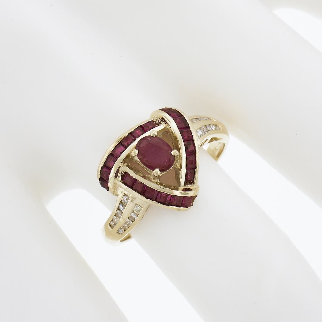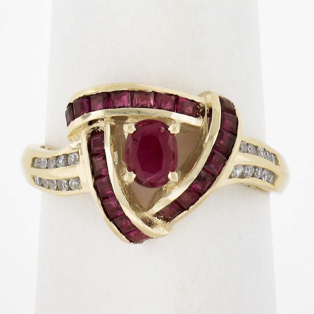 a solid 14k yellow gold knot ring, with 21 oval & square cut natural rubies (0.90ctw), and 20 round cut natural diamonds (G/I - SI1-I1 ; 0.20ctw). The ring is size 7.0, weighs a total of 3.40 grams, and measures 11.4mm wide.