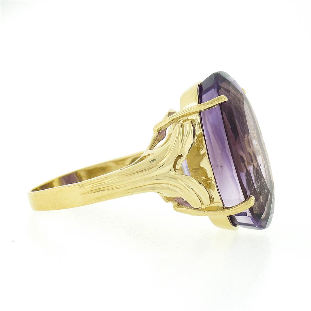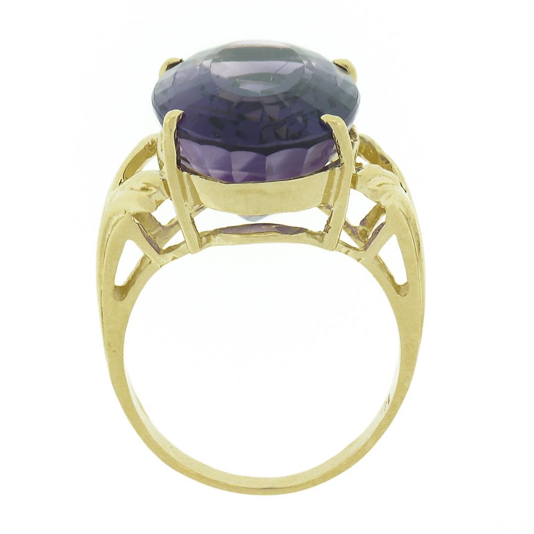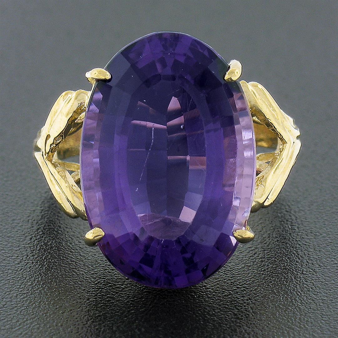 A solid 14k yellow gold solitaire ring, with 1 oval cut natural amethyst (19.5x13.3mm - 15ct).The ring is size 7.5, weighs a total of 7.48 grams, and measures 19.50mm wide.