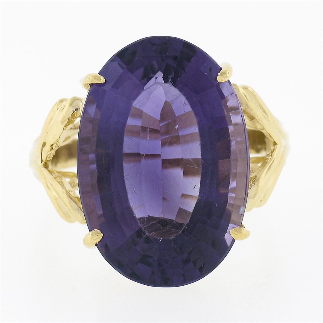 A solid 14k yellow gold solitaire ring, with 1 oval cut natural amethyst (19.5x13.3mm - 15ct).The ring is size 7.5, weighs a total of 7.48 grams, and measures 19.50mm wide.