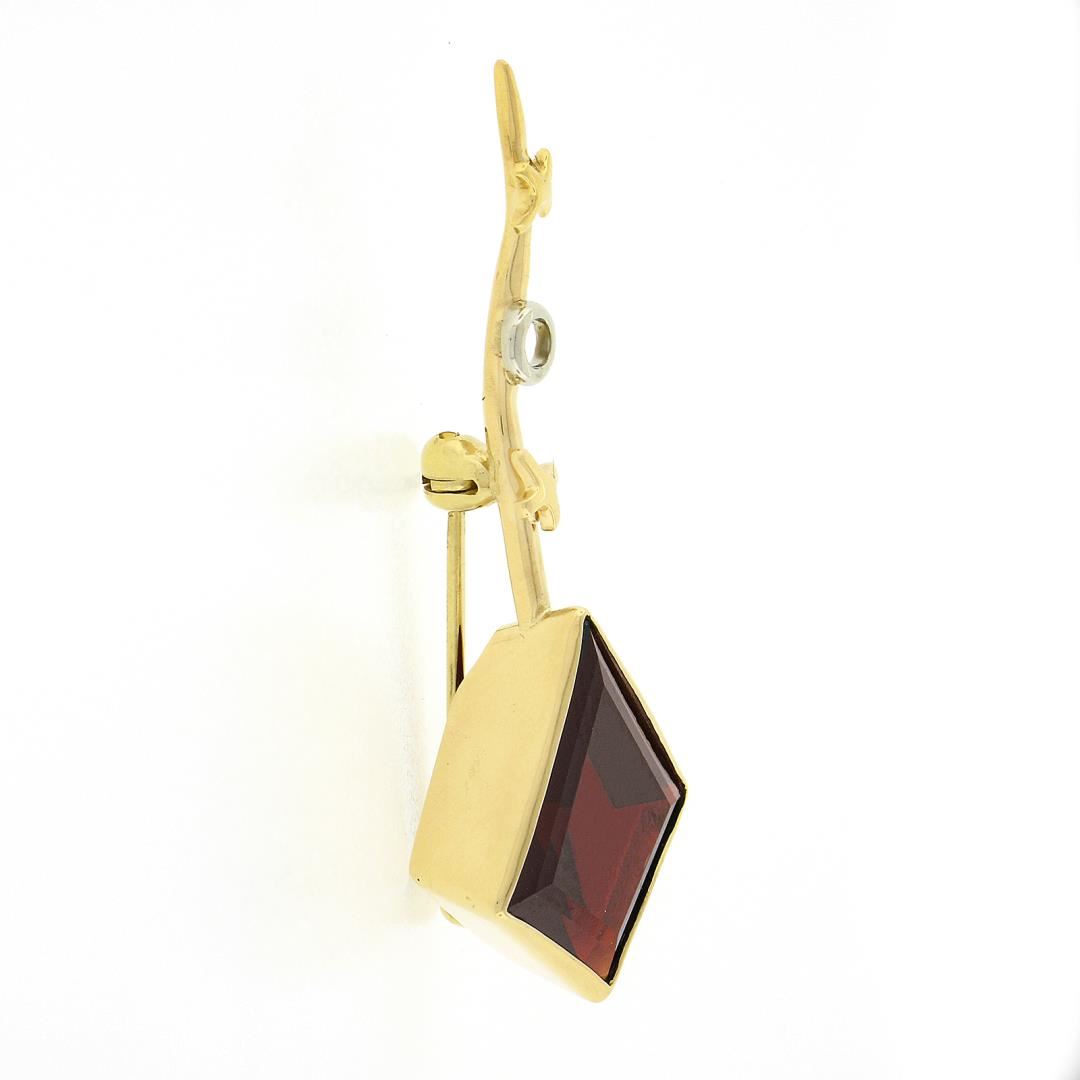 A solid 14k two tone gold kite brooch, with 1 lozenge shape natural garnet (17.3x15.1mm ). Measures 42.20x16.20mm and weighs a total of 5.84 grams.