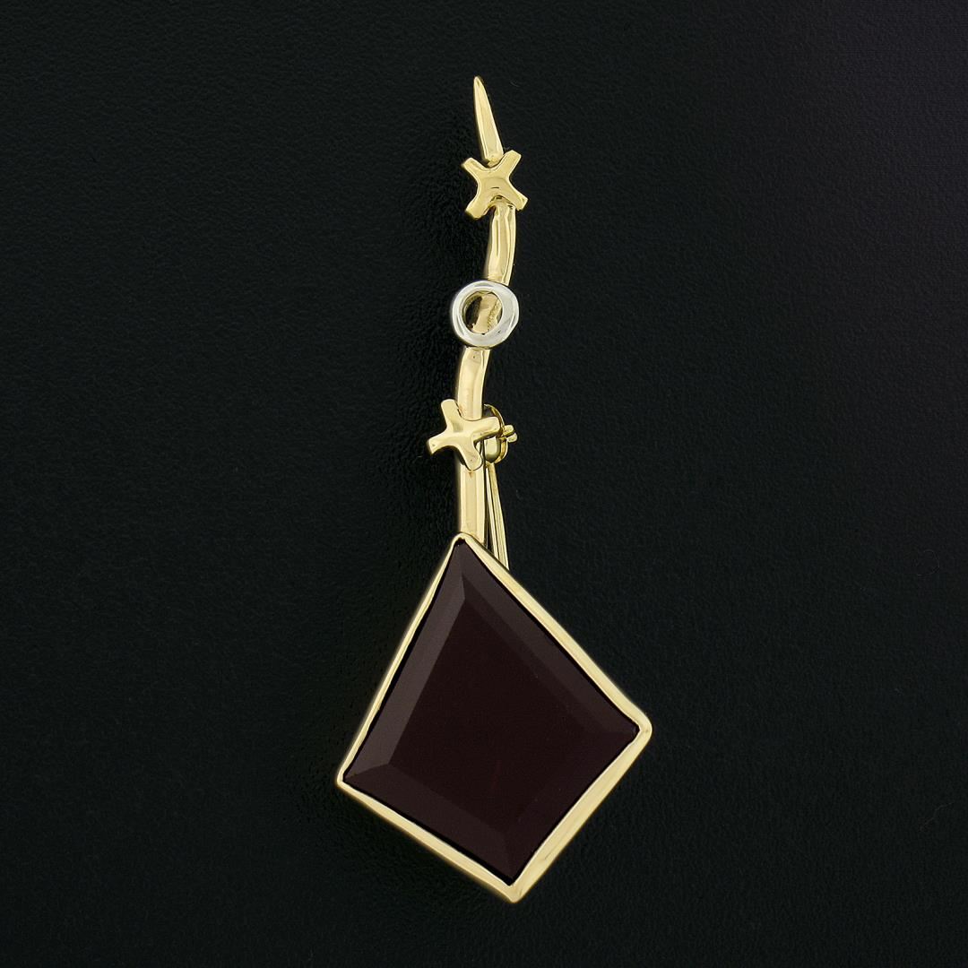 A solid 14k two tone gold kite brooch, with 1 lozenge shape natural garnet (17.3x15.1mm ). Measures 42.20x16.20mm and weighs a total of 5.84 grams.