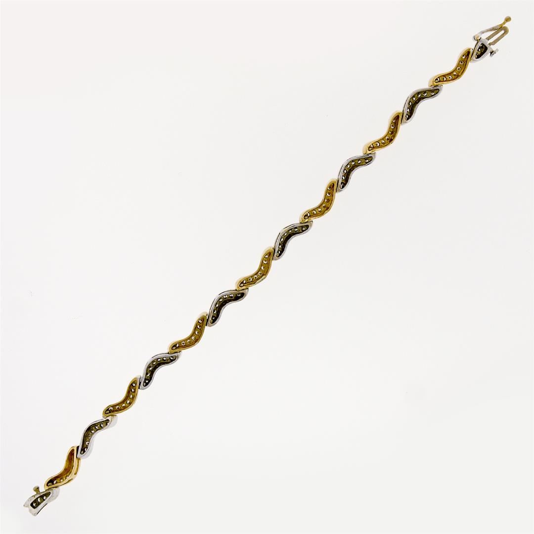 An estate solid 18k yellow and white gold wavy tennis bracelet, with 98 round brilliant cut natural diamonds ( G/H - VS1/VS2; 1.40ctw). It weighs a total of 18.34 grams, measures 5.4mm wide, and measures 7 inches in length.