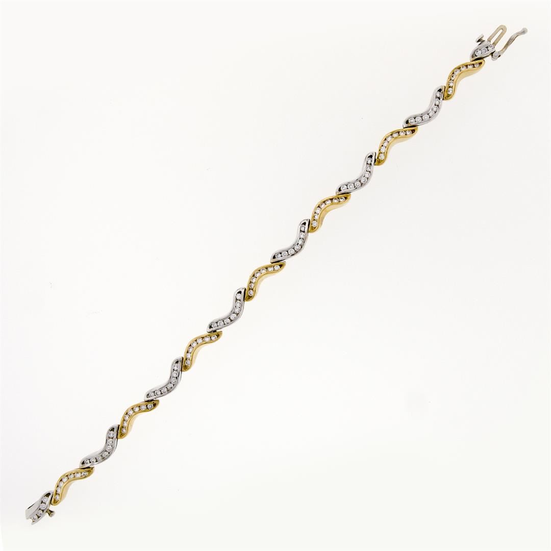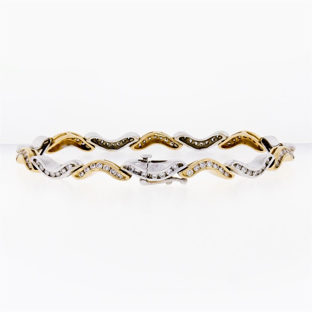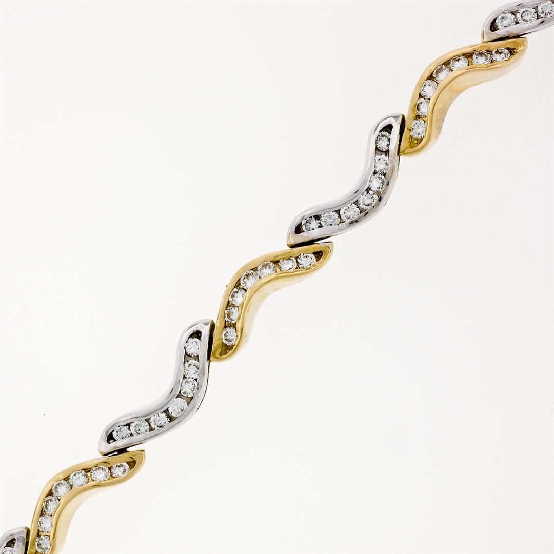 An estate solid 18k yellow and white gold wavy tennis bracelet, with 98 round brilliant cut natural diamonds ( G/H - VS1/VS2; 1.40ctw). It weighs a total of 18.34 grams, measures 5.4mm wide, and measures 7 inches in length.