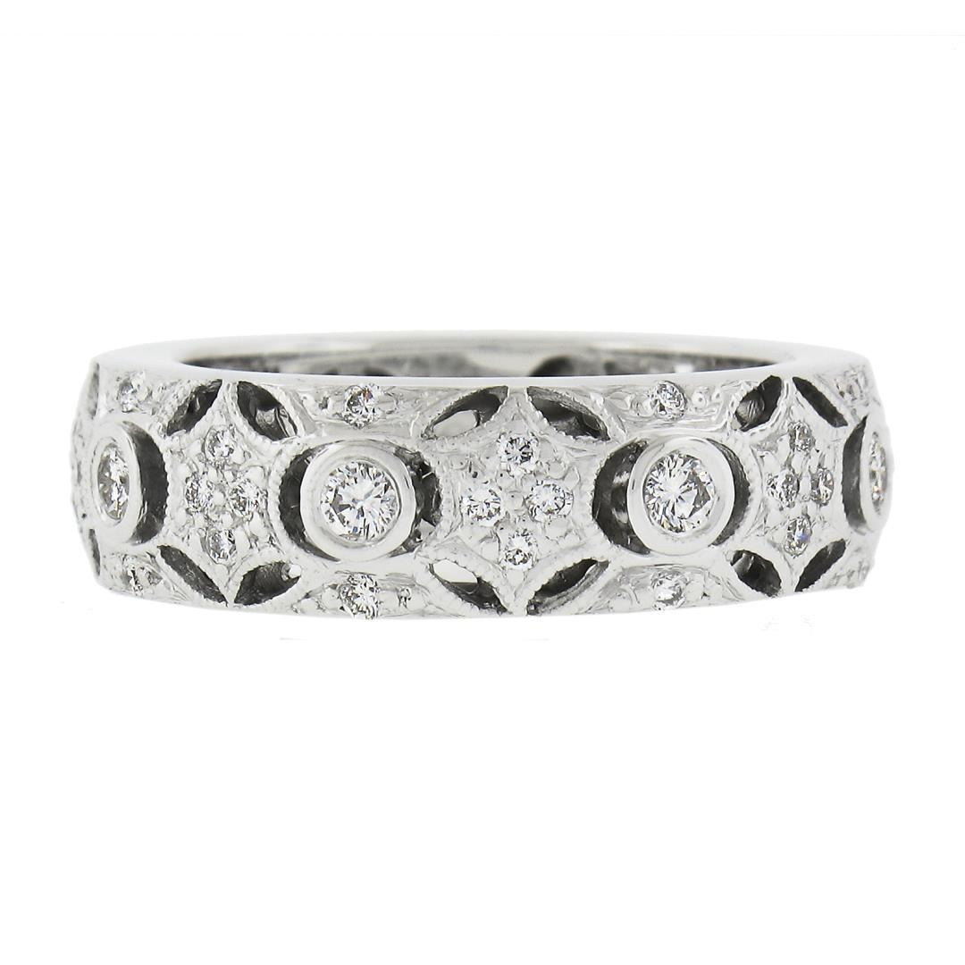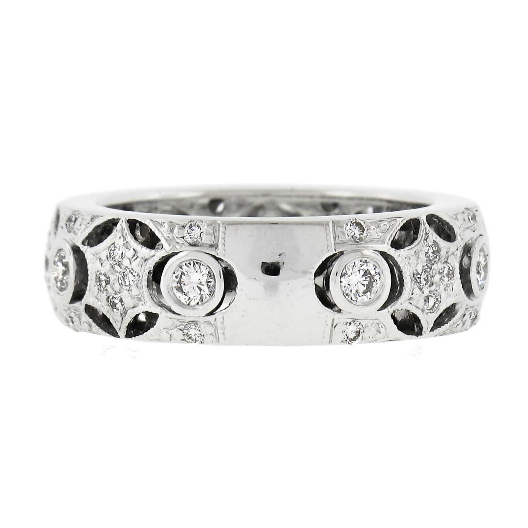 Solid 18K White Gold 0.76ct Star Pave & Bezel Diamond Open Work Wide Band Ring