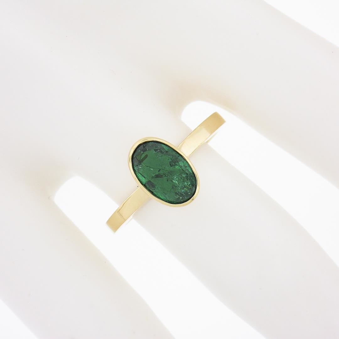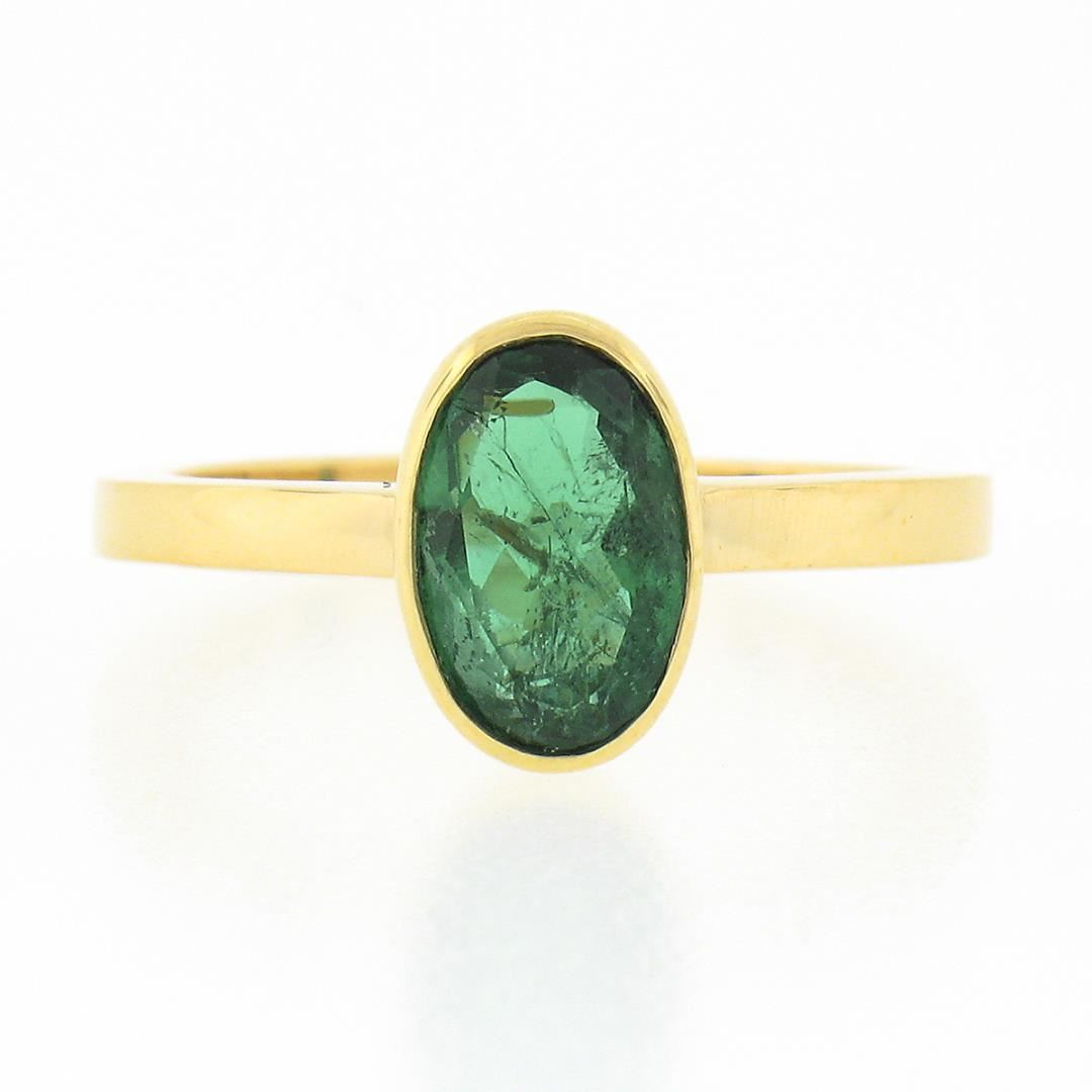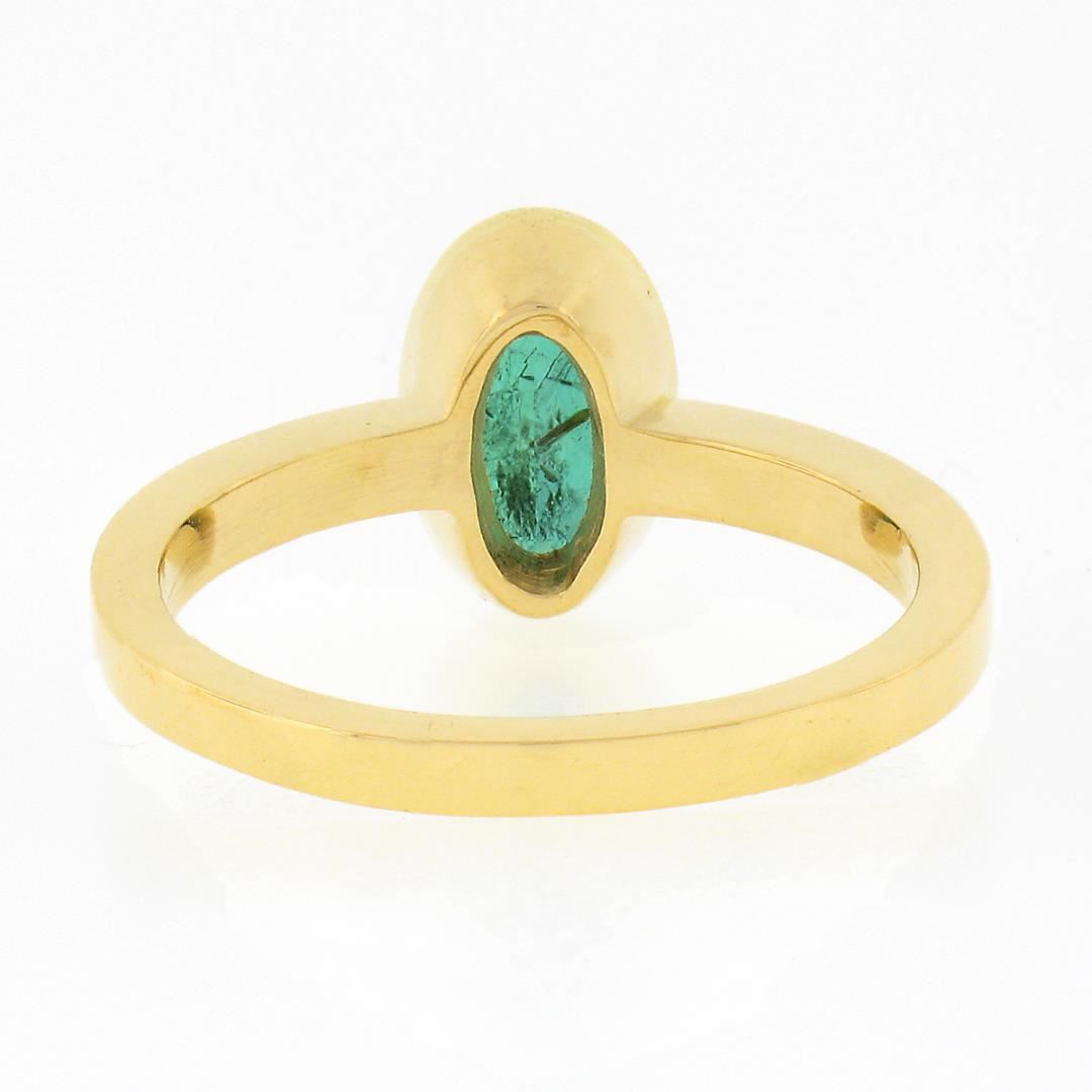 A solid 18k yellow gold solitaire ring, with 1 oval cut natural emerald (1.21ct). The ring is size 6.5, weighs a total of 4.26 grams, and measures 10.10mm wide.