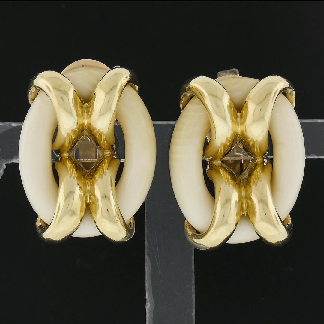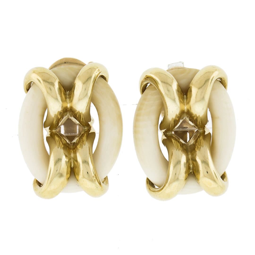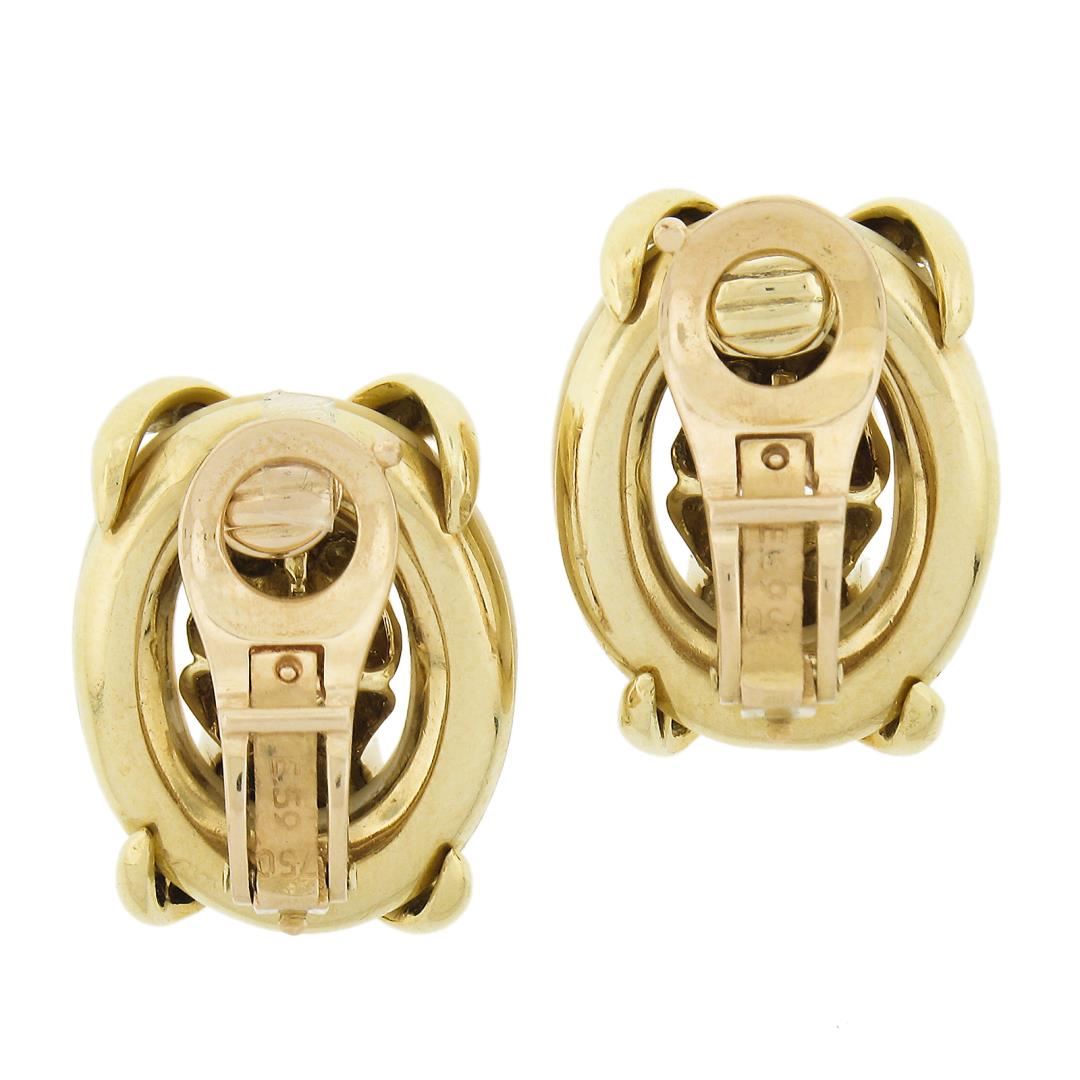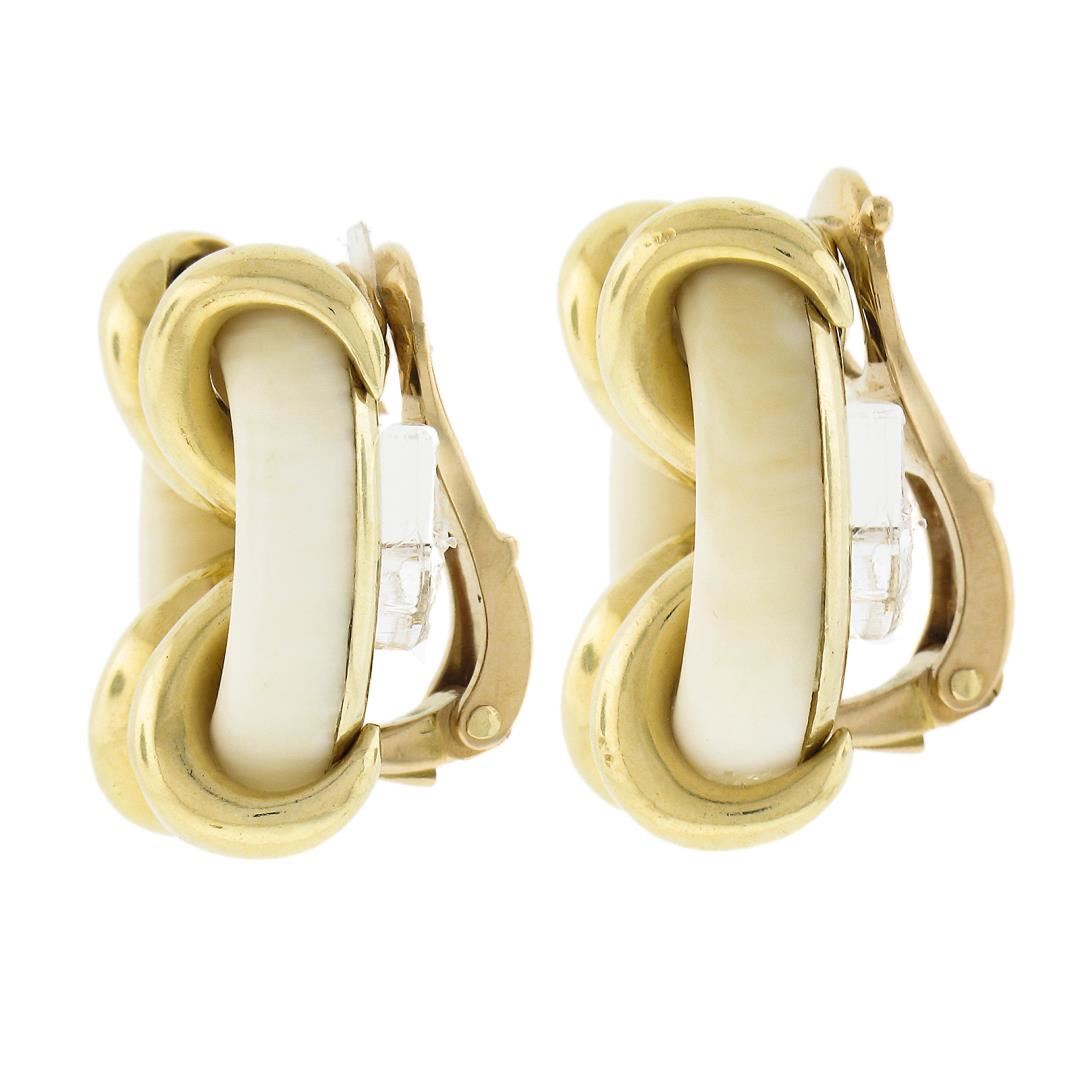A solid 18k yellow gold earrings, with 2 open oval shape natural corals (19.1x15.7mm). The earrings measure approximately 20.1x15.7mm and weigh a total of 14.26 grams.