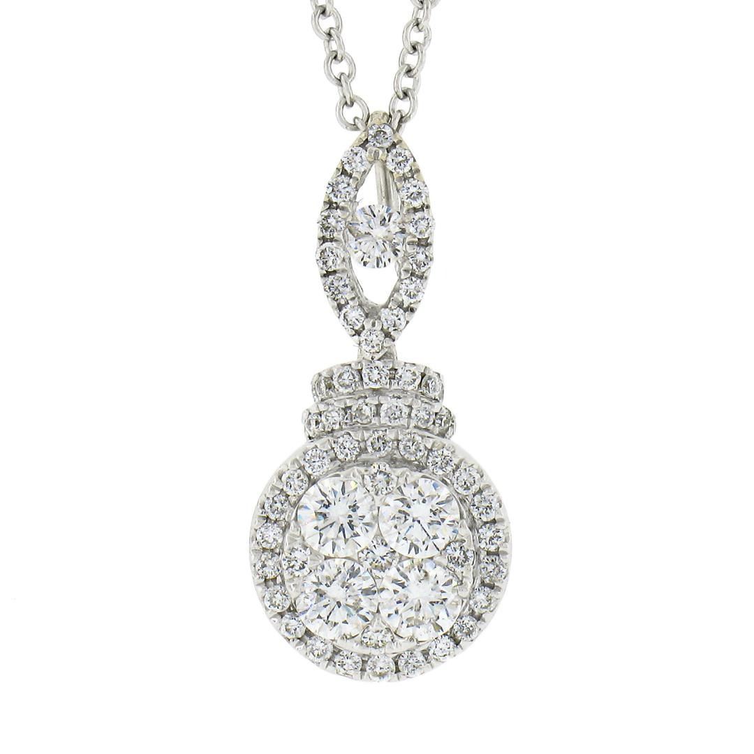 A solid 18k white gold cluster pendant necklace, with 57 round brilliant cut natural diamonds (G/H - SI1/SI2 ; 1.0ctw). 16 inch cable link chain, 3.51 grams total weight, pendant measures 21.2x9.8mm.