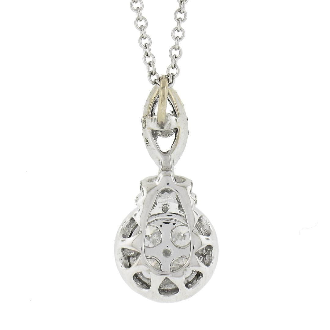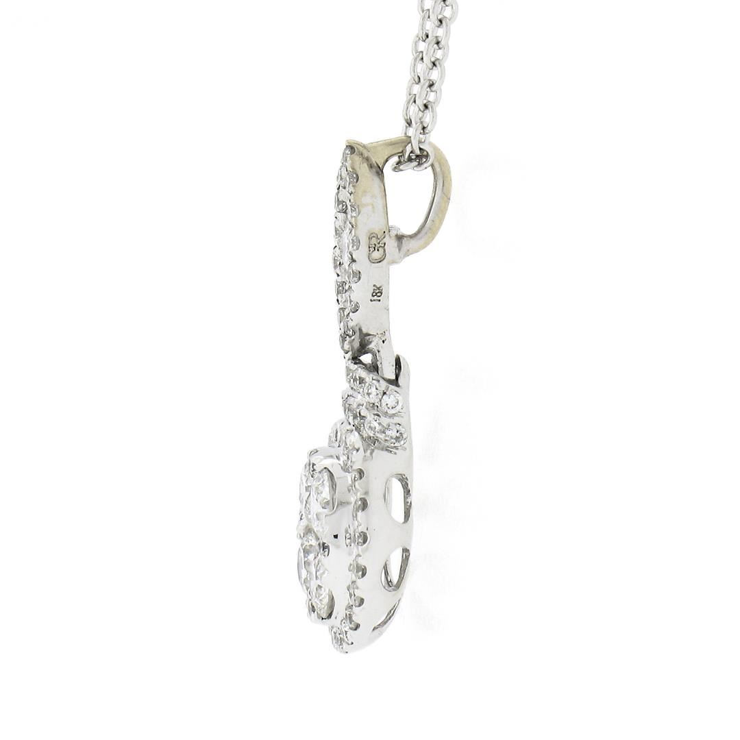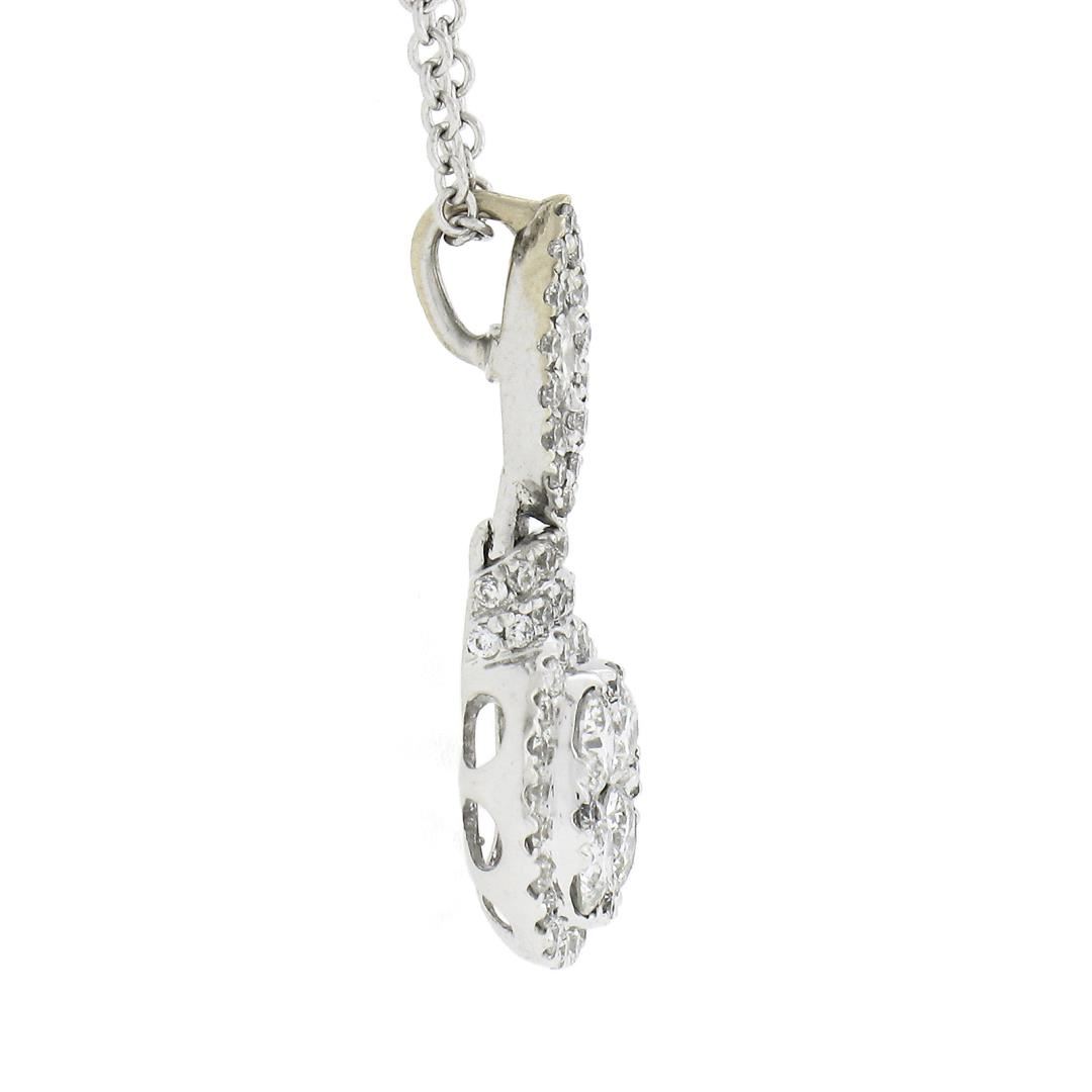 A solid 18k white gold cluster pendant necklace, with 57 round brilliant cut natural diamonds (G/H - SI1/SI2 ; 1.0ctw). 16 inch cable link chain, 3.51 grams total weight, pendant measures 21.2x9.8mm.