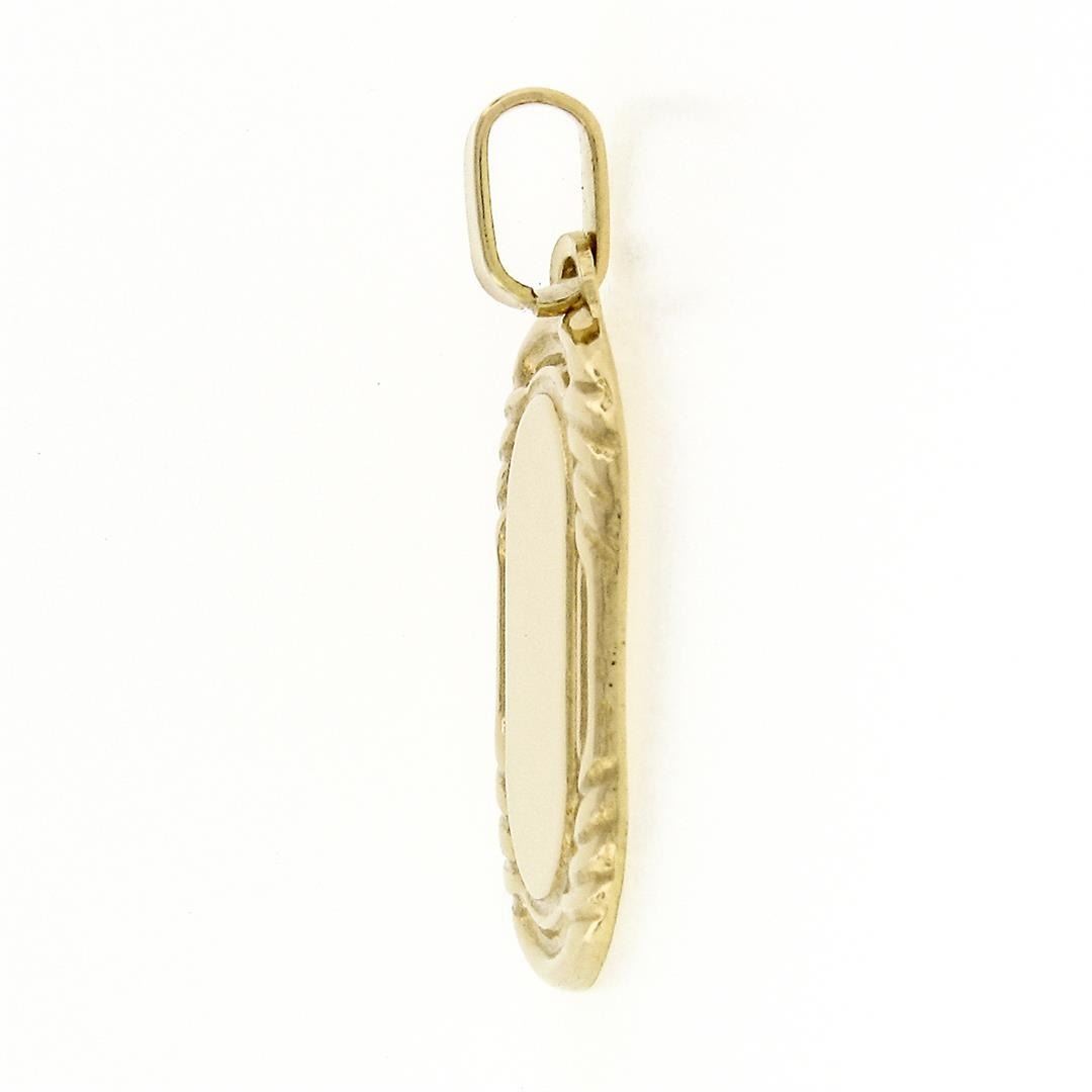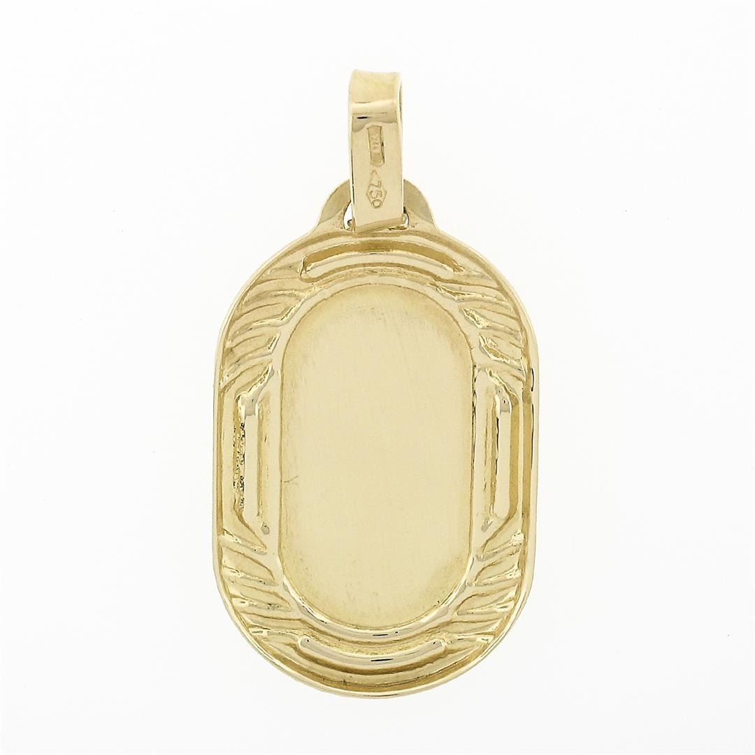 A solid 18k yellow gold engravable pendant. The pendant weighs a total of 2.74 grams, measures 30.99x15.14mm including the bail, and the inside of the bail measures 4.7x3.3mm.