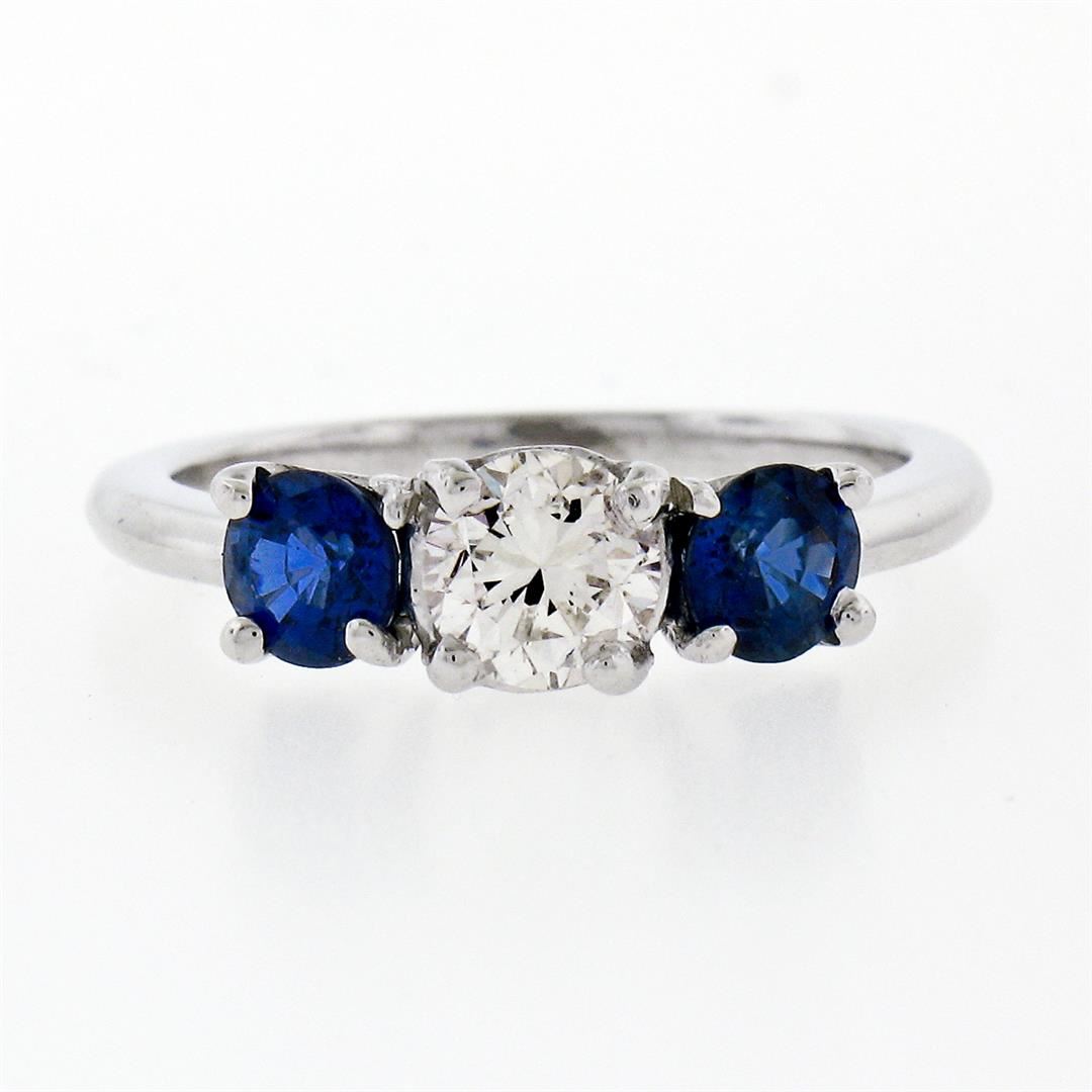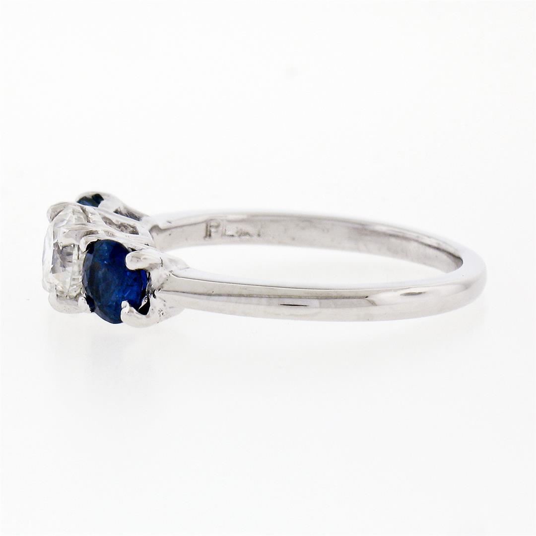 An estate solid platinum 3 stones band ring, featuring 1 round brilliant cut natural diamond (G - VS1; 0.52ct ), and 2 round brilliant cut natural sapphires (0.80ctw). The ring is size 4.5, weighs a total of 3.85 grams, and measures 5.0mm wide.